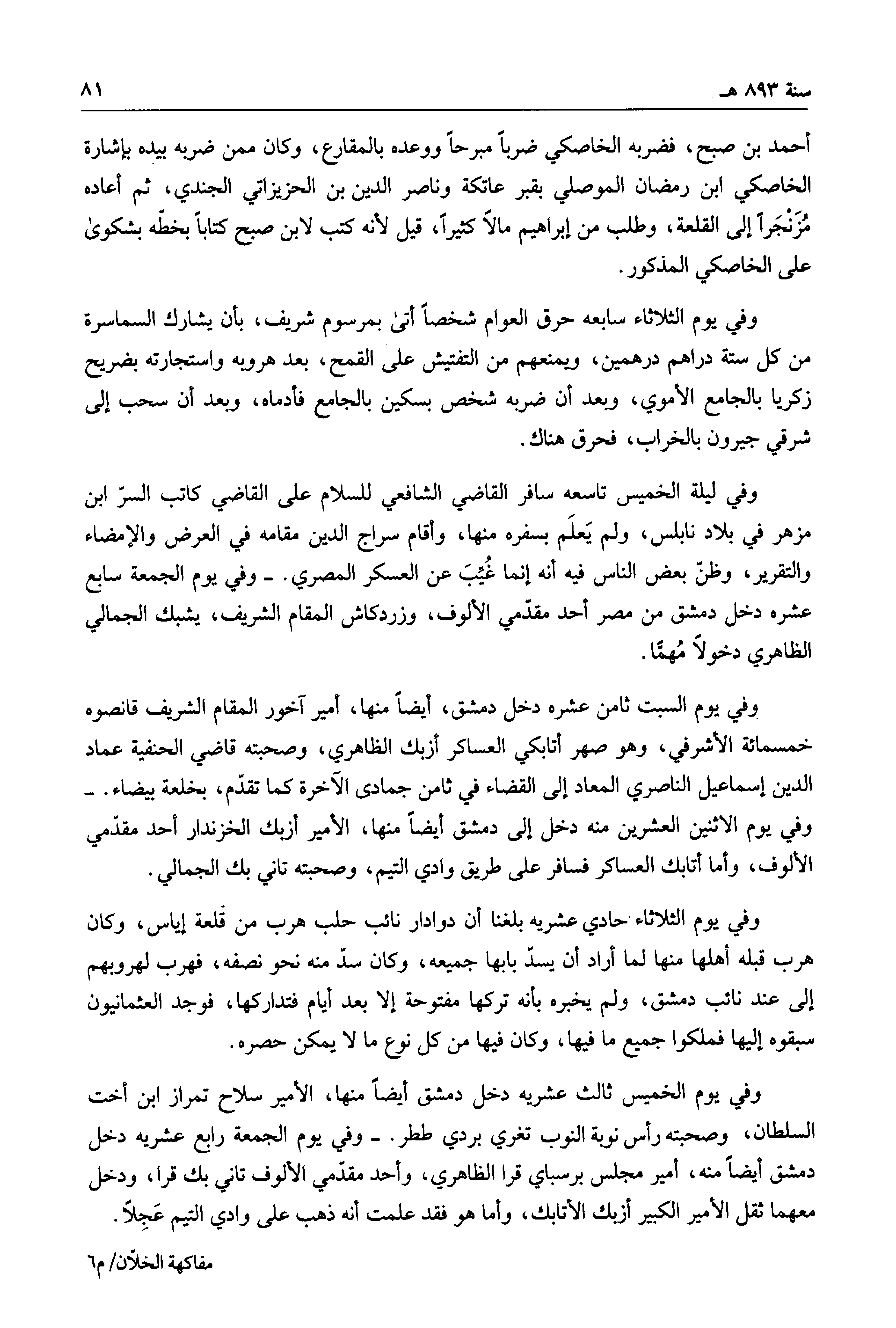 وفي يوم السبت ثامن عشره دخل دمشق، أيضاً منها، أمير آخور المقام الشريف قانصوه خمسمائة الأشرفي، وهو صهر أتابكي العساكر أزبك الظاهري، وصحبته قاضي الحنيفة عماد الدين إسماعيل الناصري المعاد إلى القضاء في ثامن جمادى الآخرة كما تقدم، بخلعة بيضاء. وفي يوم الاثنين العشرين منه دخل إلى دمشق أيضاً منها، الأمير أزبك الخزندار أحد مقدمي الألوف، وأما أتابك العساكر فسافر على طريق وادي التيم، وصحبته تاني بك الجمالي.