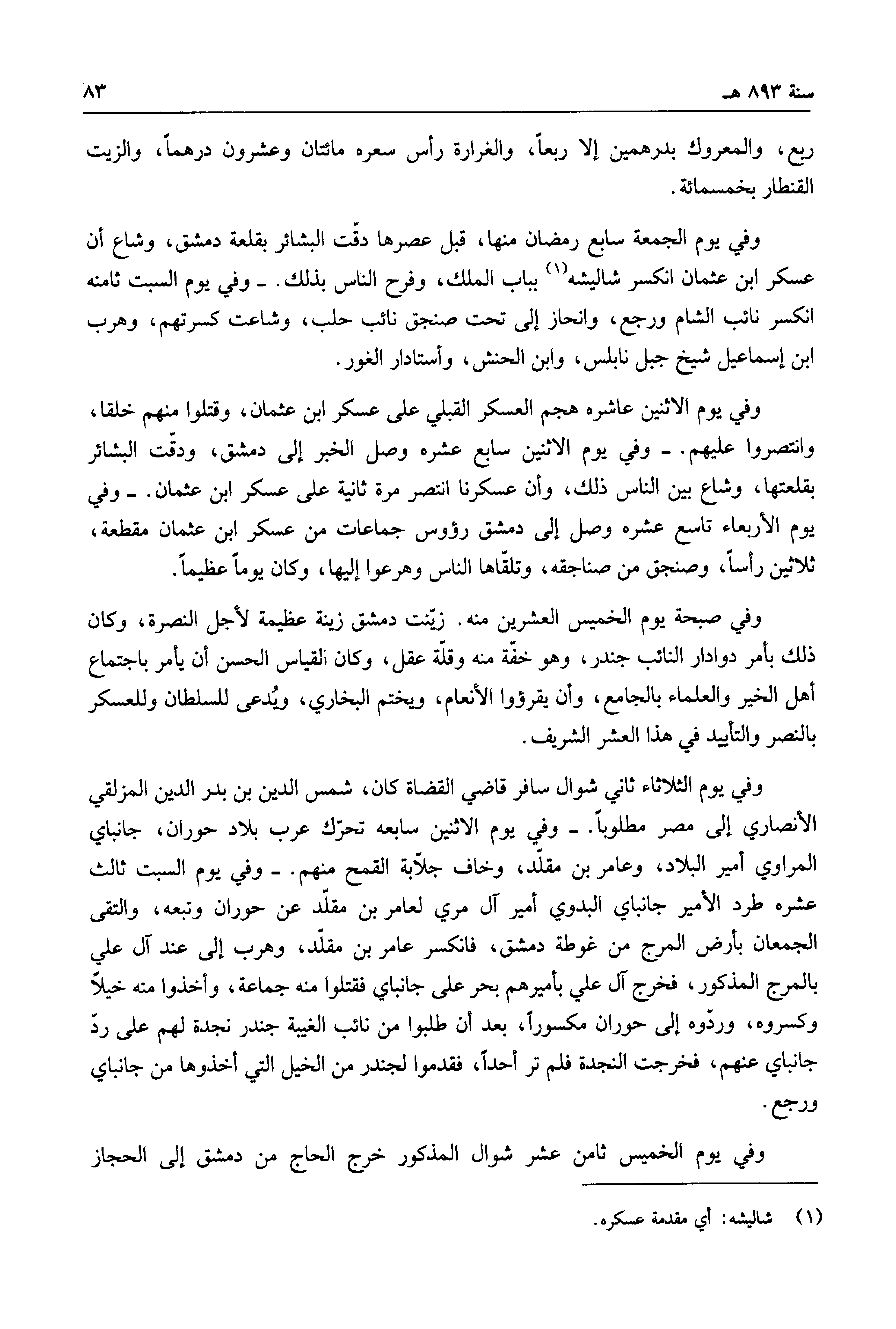 وفي يوم الجمعة سابع رمضان منها، قبل عصرها دقت البشائر بقلعة دمشق، وشاع أن عسكر ابن عثمان انكسر شاليشه بباب الملك، وفرح الناس بذلك.