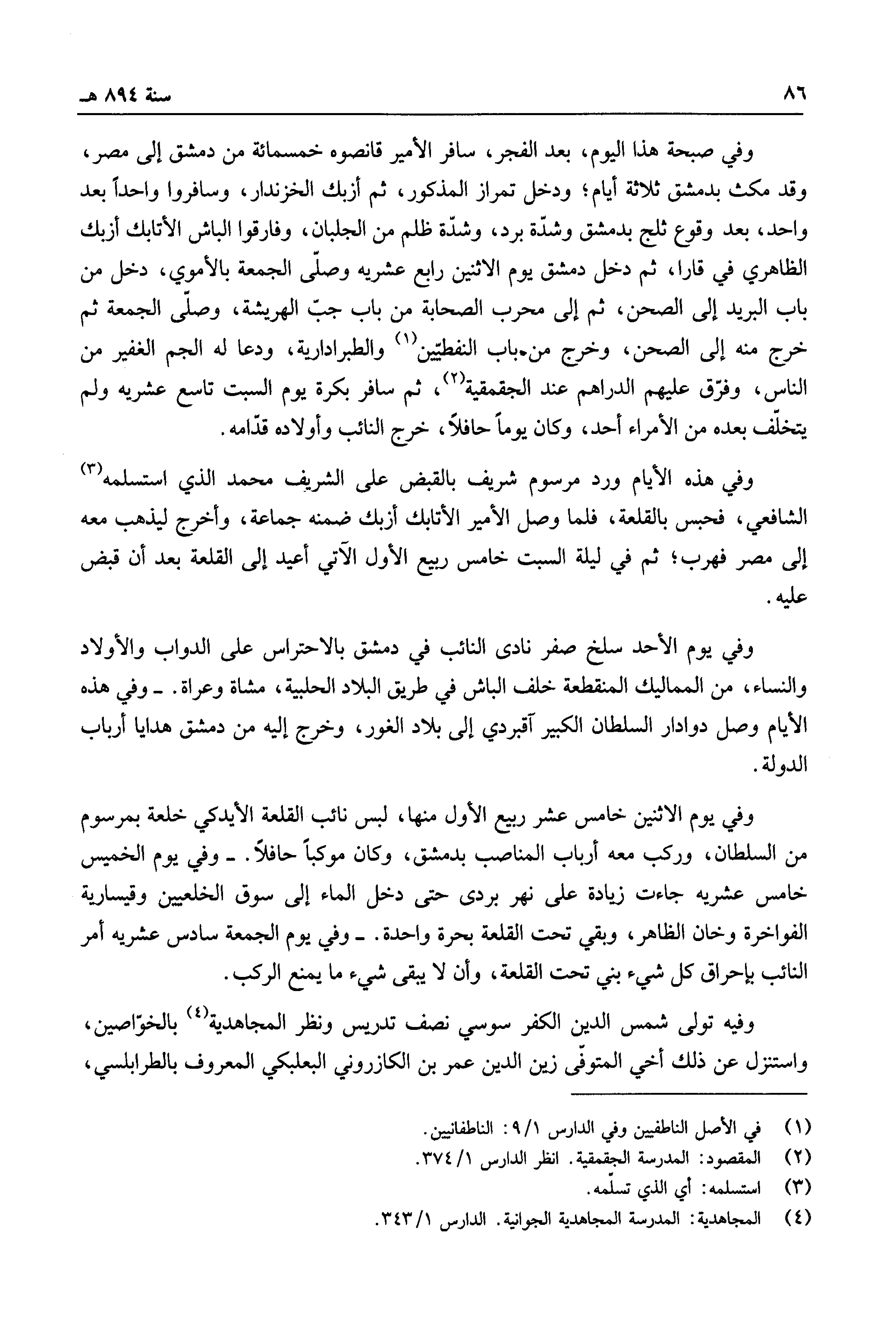 وفي يوم الأحد سلخ صفر نادى النائب في دمشق بالاحتراس على الدواب والأولاد والنساء، من المماليك المنقطعة خلف الباش في طريق البلاد الحلبية، مشاة وعراة. وفي هذه الأيام وصل دوادار السلطان الكبير آقبردي إلى بلاد الغور، وخرج إليه من دمشق هدايا أرباب الدولة.