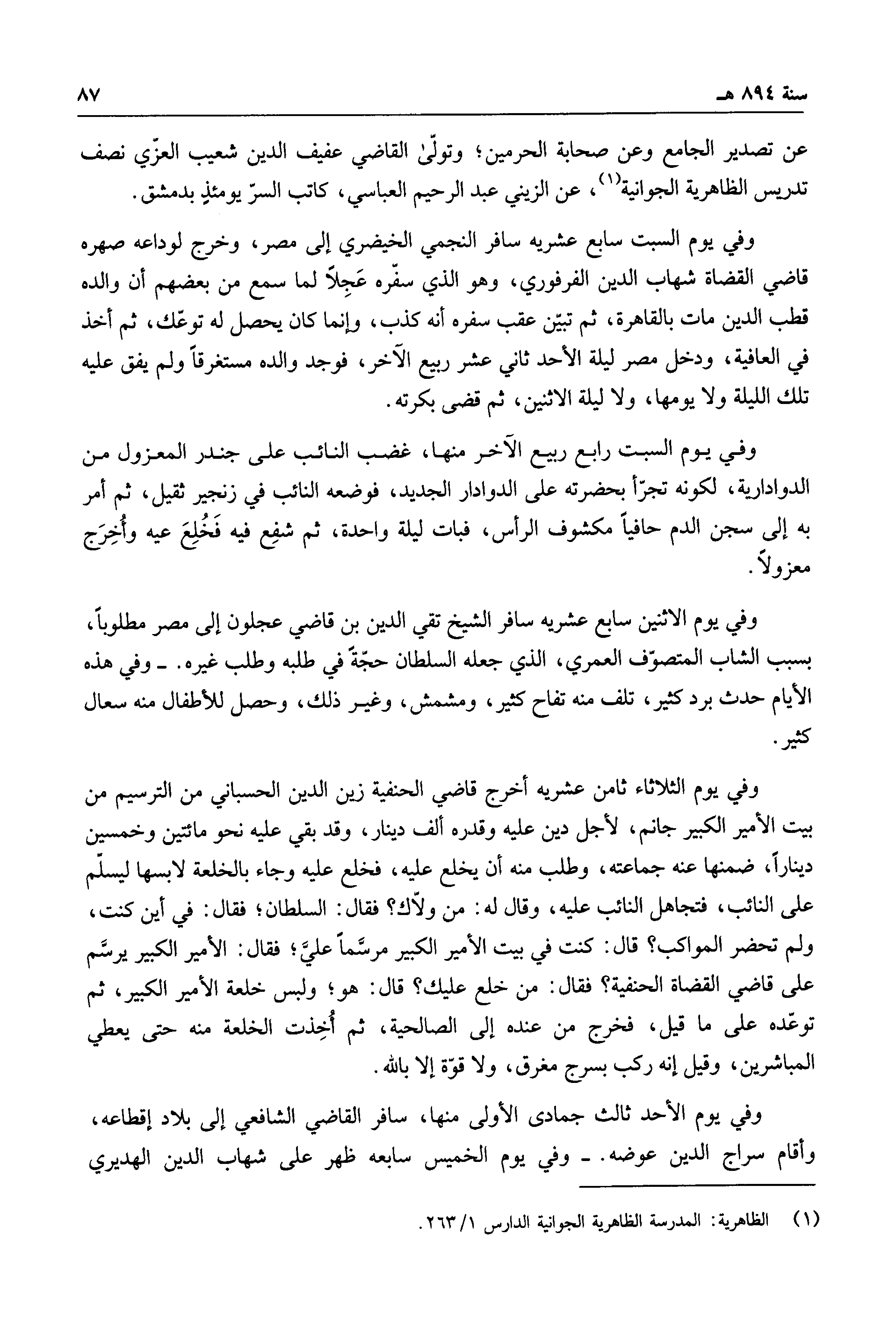 عن تصدير الجامع وعن صحابة الحرمين؛ وتولى القاضي عفيف الدين شعيب العزي نصف تدريس الظاهرية الجوانية، عن الزيني عبد الرحيم العباسي، كاتب السر يومئذٍ بدمشق.
