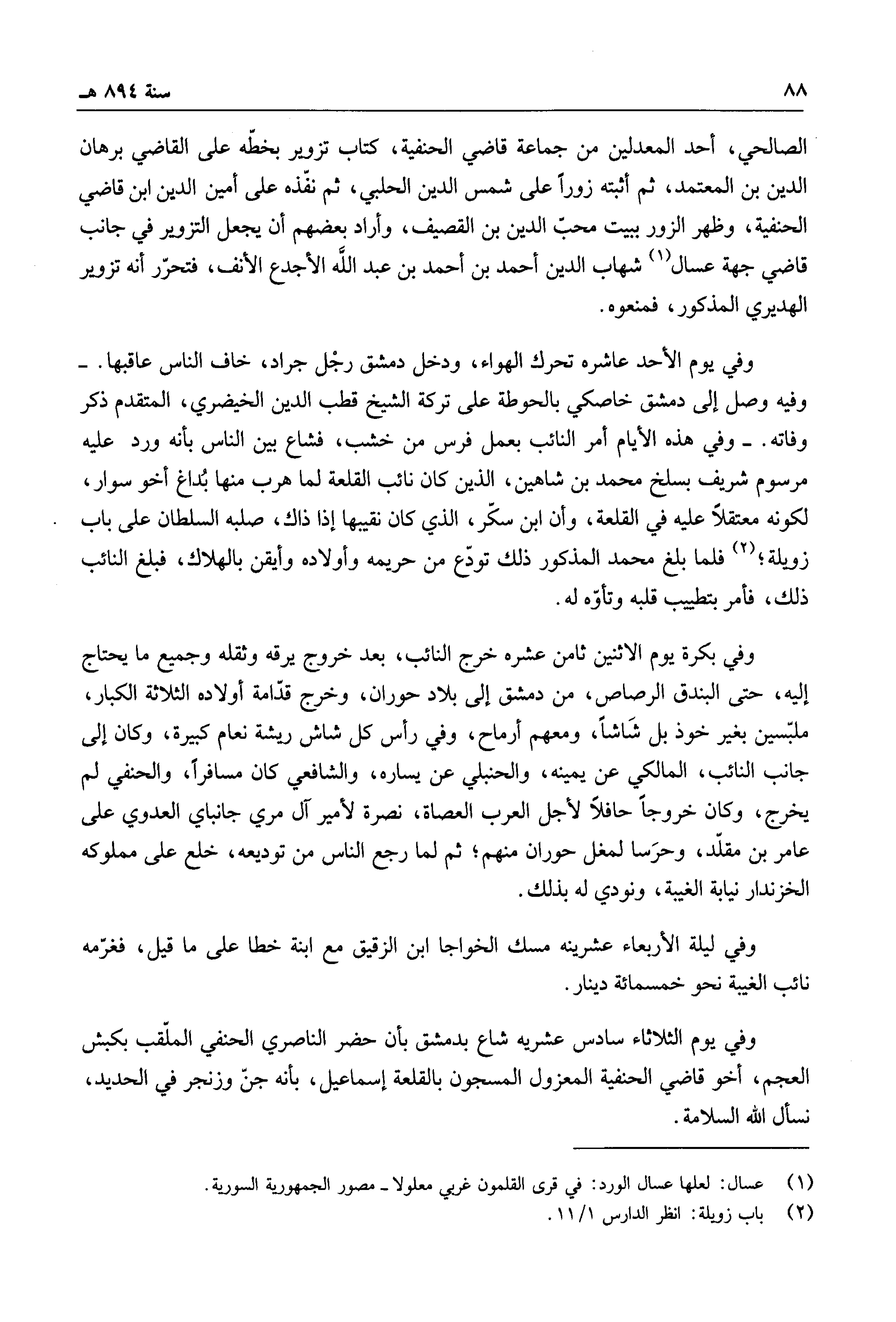 الصالحي، أحد المعدلين من جماعة قاضي الحنفية، كتاب تزوير بخطه على القاضي برهان الدين بن المعتمد، ثم أثبته زوراً على شمس الدين الحلبي، ثم نفذه على أمين الدين ابن قاضي الحنفية، وظهر الزور ببيت محب الدين بن القصيف، وأراد بعضهم أن يجعل التزوير في جانب قاضي جهة عسال شهاب الدين أحمد بن أحمد بن عبد الله الأجدع الأنف، فتحرر أنه تزوير الهديري المذكور، فمنعوه.