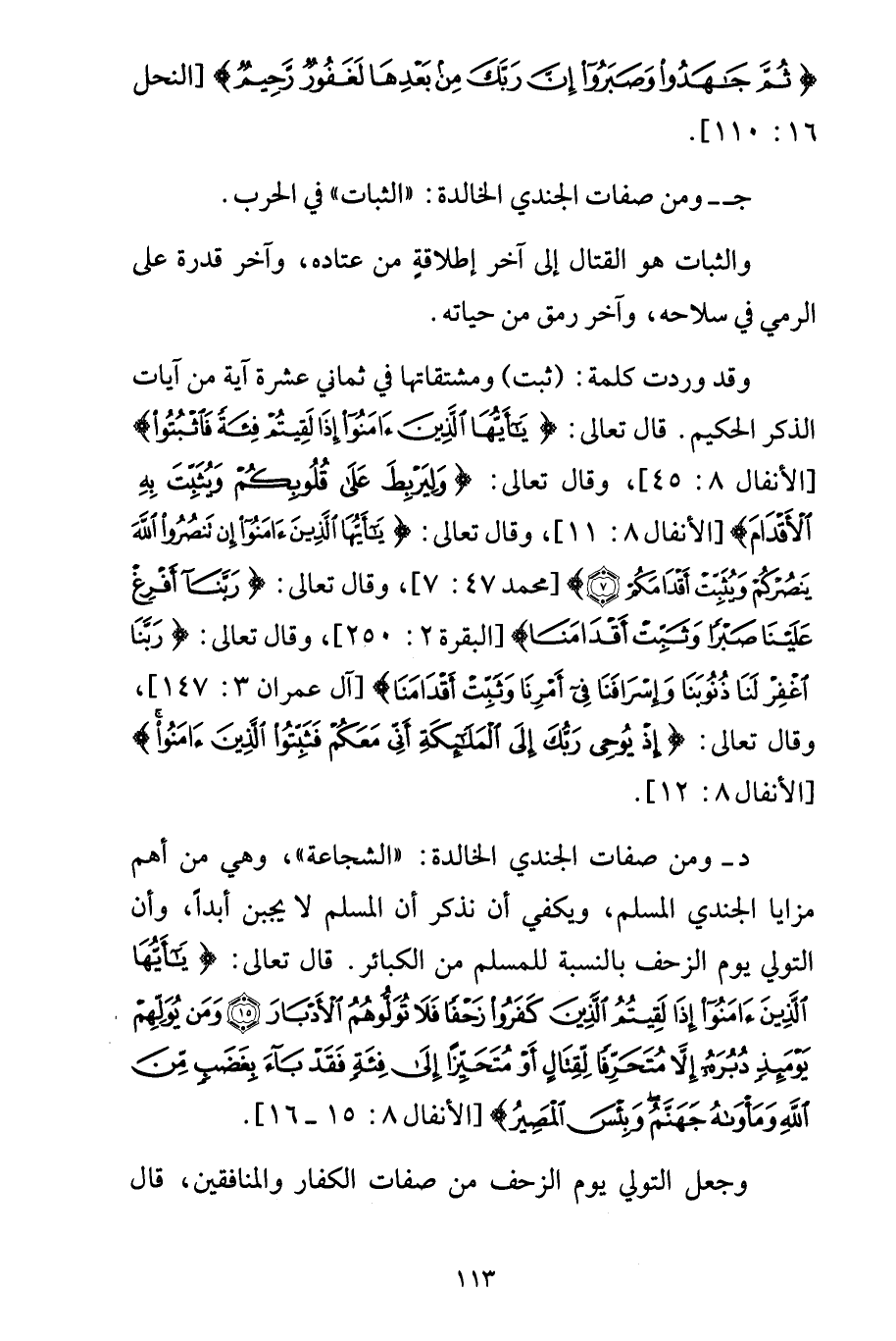 د- ومن صفات الجندي الخالدة: "الشجاعة"، وهي من أهم مزايا الجندي المسلم، ويكفي أن نذكر أن المسلم لا يجبن أبداً، وأن التولي يوم الزحف بالنسبة للمسلم من الكبائر. قال تعالى: {يَا أَيُّهَا الَّذِينَ آمَنُواْ إِذَا لَقِيتُمُ الَّذِينَ كَفَرُواْ زَحْفاً فَلاَ تُوَلُّوهُمُ الأَدْبَارَ 15 وَمَن يُوَلِّهِمْ يَوْمَئِذٍ دُبُرَهُ إِلاَّ مُتَحَرِّفاً لِّقِتَالٍ أَوْ مُتَحَيِّزاً إِلَى فِئَةٍ فَقَدْ بَاء بِغَضَبٍ مِّنَ اللَّهِ وَمَأْوَاهُ جَهَنَّمُ وَبِئْسَ الْمَصِيرُ} [الأنفال 8: 15 - 16].