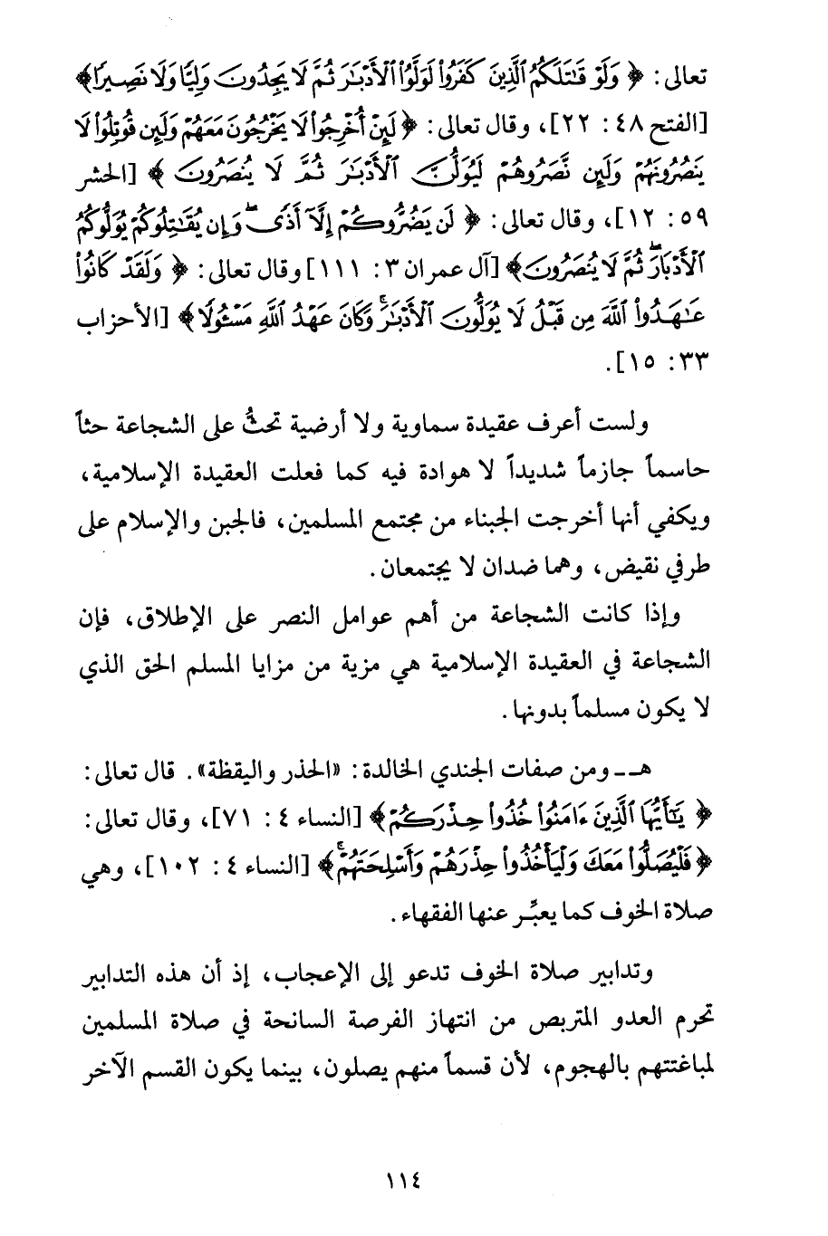 هـ- ومن صفات الجندي الخالدة: "الحذر واليقظة". قال تعالى: {يَا أَيُّهَا الَّذِينَ آمَنُواْ خُذُواْ حِذْرَكُمْ} [النساء4: 71]، وقال تعالى: {فَلْيُصَلُّواْ مَعَكَ وَلْيَأْخُذُواْ حِذْرَهُمْ وَأَسْلِحَتَهُمْ} [النساء4: 102]، وهي صلاة الخوف كما يعبِّر عنها الفقهاء.