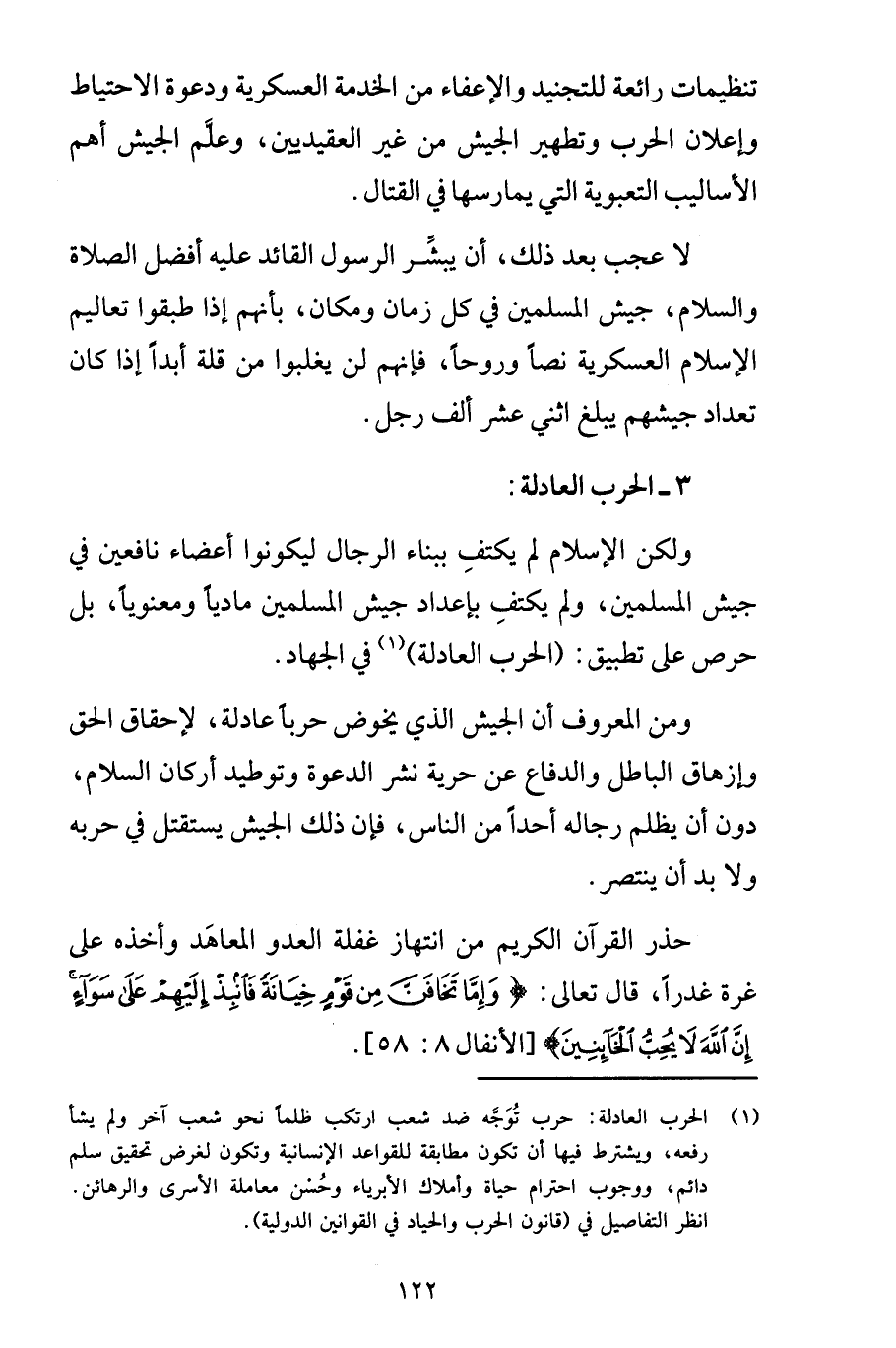 ولكن الإسلام لم يكتفِ ببناء الرجال ليكونوا أعضاء نافعين في جيش المسلمين، ولم يكتفِ بإعداد جيش المسلمين مادياً ومعنوياً، بل حرص على تطبيق: (الحرب العادلة) (1) في الجهاد.
