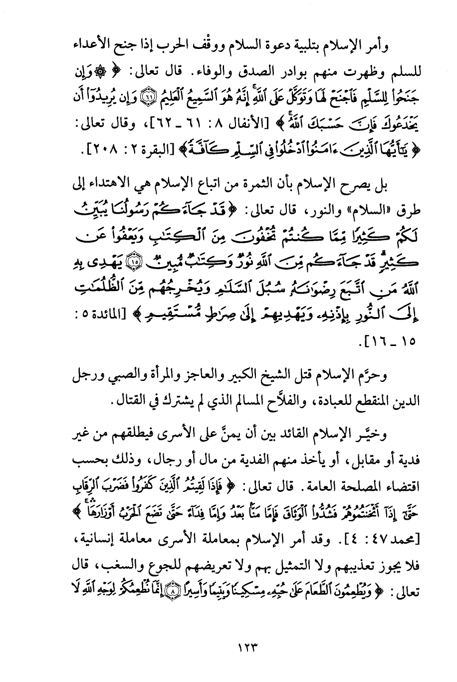 وحرَّم الإسلام قتل الشيخ الكبير والعاجز والمرأة والصبي ورجل الدين المنقطع للعبادة، والفلاَّح المسالم الذي لم يشترك في القتال.