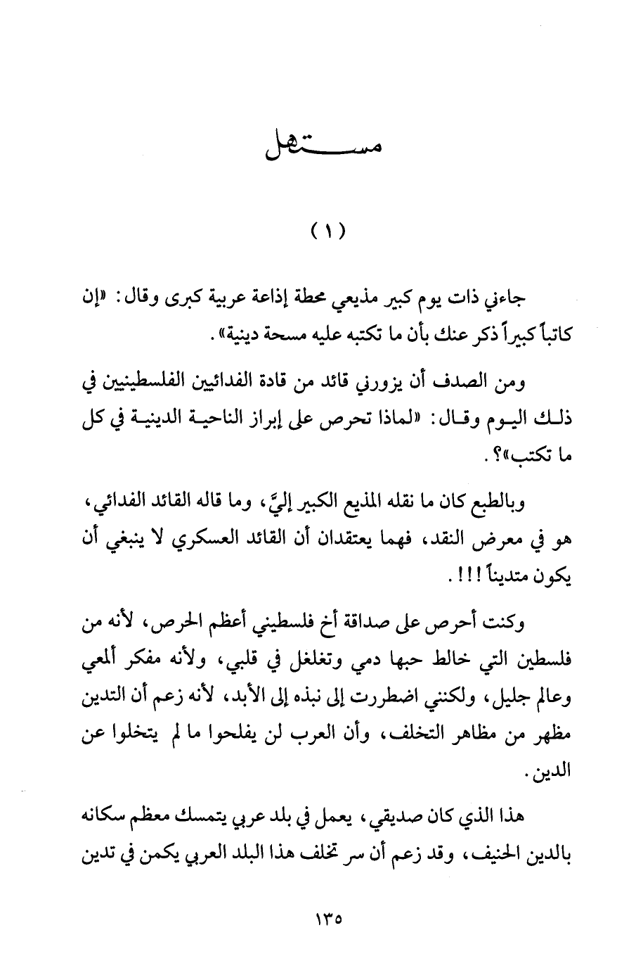 جاءني ذات يوم كبير مذيعي محطة إذاعة عربية كبرى وقال: "إن كاتباً كبيراً ذكر عنك بأن ما تكتبه عليه مسحة دينية".