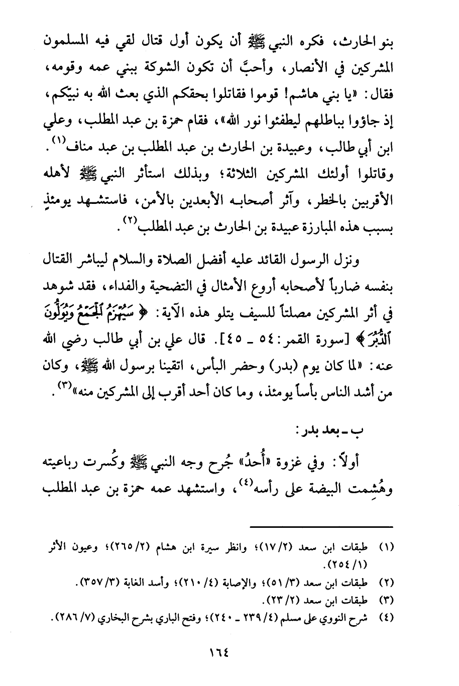 وقاتلوا أولئك المشركين الثلاثة؛ وبذلك استأثر النبي - صلى الله عليه وسلم - لأهله الأقربين بالخطر، وآثر أصحابه الأبعدين بالأمن، فاستشهد يومئذٍ بسبب هذه المبارزة عبيدة بن الحارث بن عبد المطلب (2).