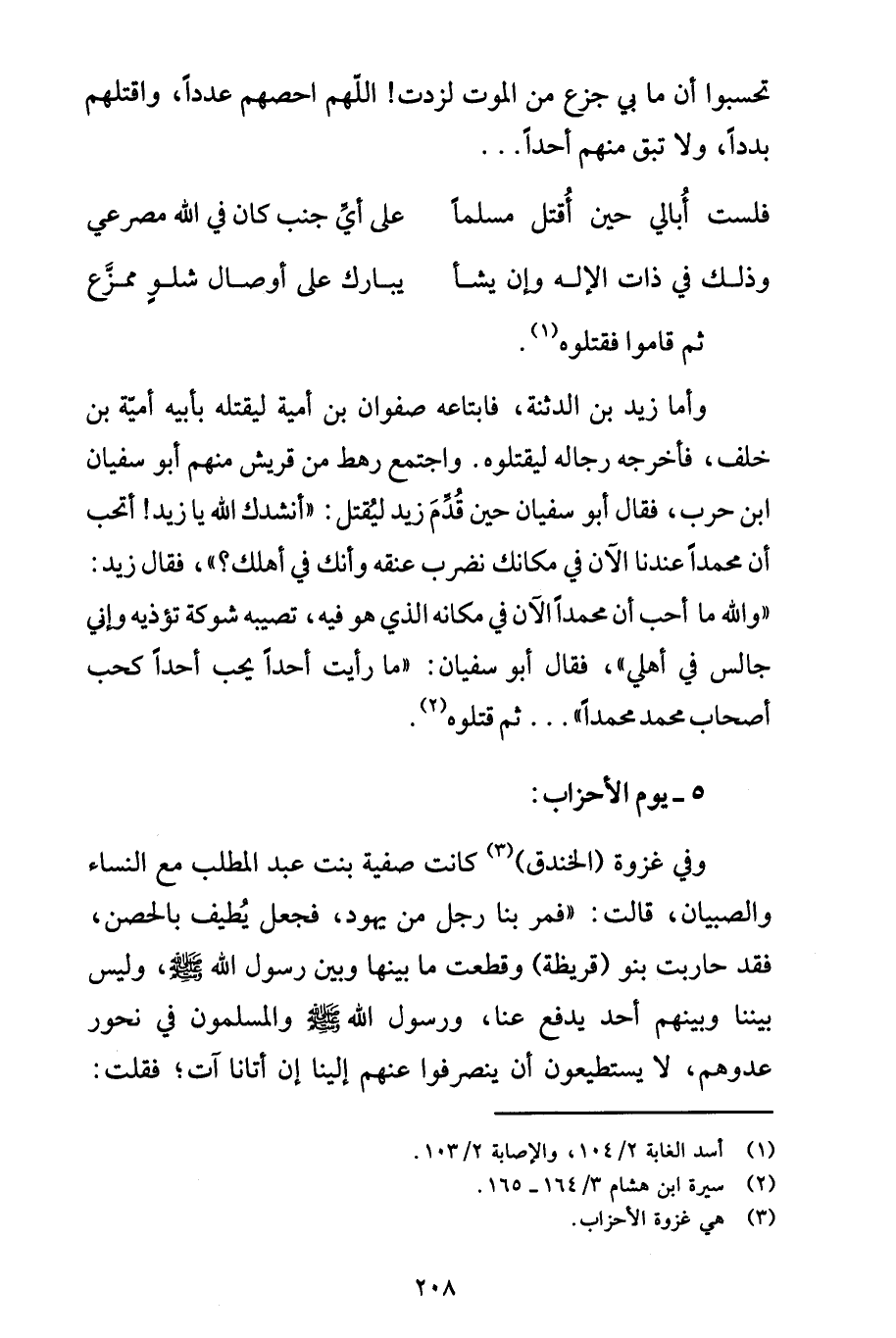وأما زيد بن الدثنة، فابتاعه صفوان بن أمية ليقتله بأبيه أميّة بن خلف، فأخرجه رجاله ليقتلوه. واجتمع رهط من قريش منهم أبو سفيان ابن حرب، فقال أبو سفيان حين قُدِّمَ زيد ليُقتل: "أنشدك الله يا زيد! أتحب أن محمداً عندنا الآن في مكانك نضرب عنقه وأنك في أهلك؟ "، فقال زيد: "والله ما أحب أن محمداً الآن في مكانه الذي هو فيه، تصيبه شوكة تؤذيه وإني جالس في أهلي"، فقال أبو سفيان: "ما رأيت أحداً يحب أحداً كحب أصحاب محمد محمداً" ... ثم قتلوه (2).