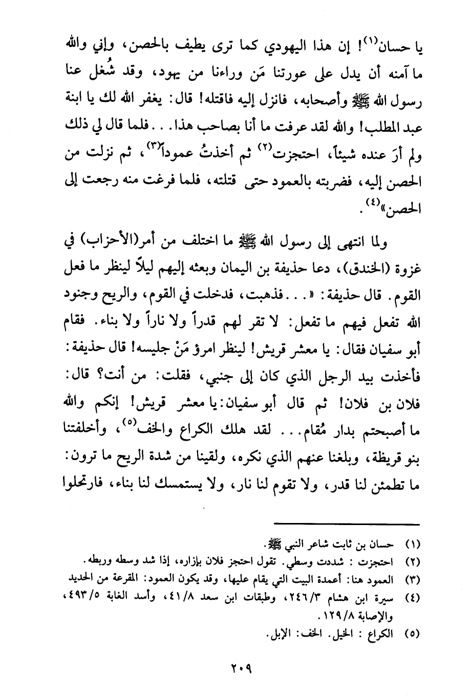 يا حسان (1)! إن هذا اليهودي كما ترى يطيف بالحصن، وإني والله ما آمنه أن يدل على عورتنا مَن وراءنا من يهود، وقد شُغل عنا رسول الله - صلى الله عليه وسلم - وأصحابه، فانزل إليه فاقتله! قال: يغفر الله لك يا ابنة عبد المطلب! والله لقد عرفت ما أنا بصاحب هذا ... فلما قال لي ذلك ولم أرَ عنده شيئاً، احتجزت (2) ثم أخذتُ عموداً (3)، ثم نزلت من الحصن إليه، فضربته بالعمود حتى قتلته، فلما فرغت منه رجعت إلى الحصن" (4).