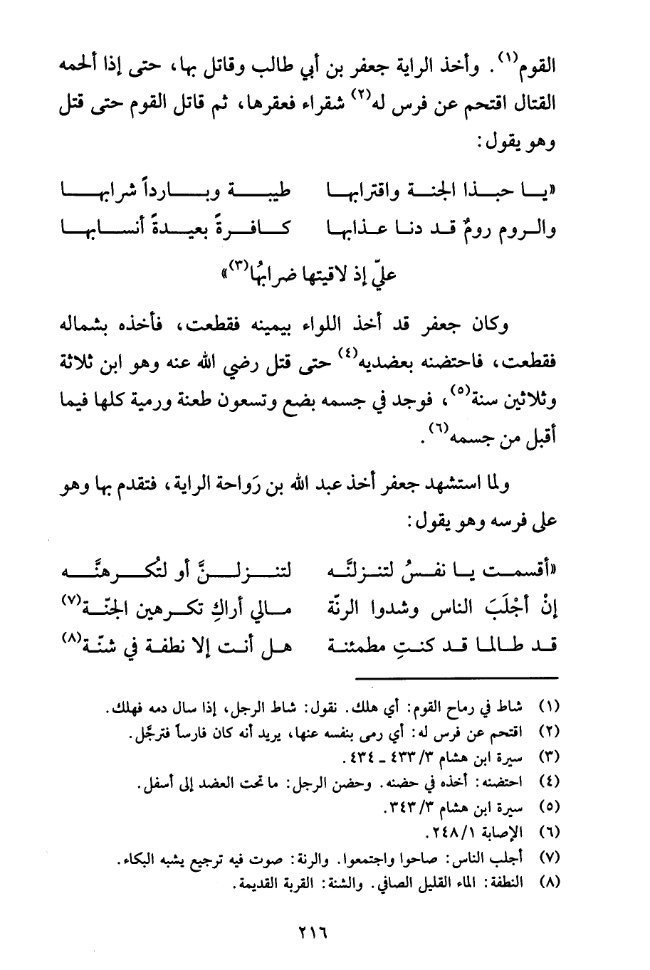 ولما استشهد جعفر أخذ عبد الله بن رَواحة الراية، فتقدم بها وهو على فرسه وهو يقول: "أقسمت يا نفسُ لتنزلنَّه لتنزلنَّ أو لتُكرهنَّه إنْ أجْلَبَ الناس وشدوا الرنّة مالي أراكِ تكرهين الجنّة (7) قد طالما قدكنتِ مطمئنة هل أنت إلا نطفة في شنّة (8)