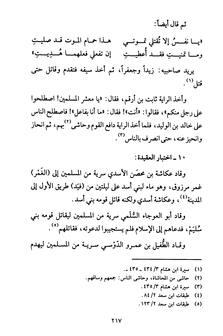 ثم قال أيضاً: "يا نفسُ إلا تُقتلي تموتي هذا حمام الموت قد صليتِ وما تمنيتِ فقد أُعطيتِ إن تفعلي فعلهما هُدِيتِ" يريد صاحبيه: زيداً وجعفراً، ثم أخذ سيفه فتقدم وقاتل حتى قتل (1).