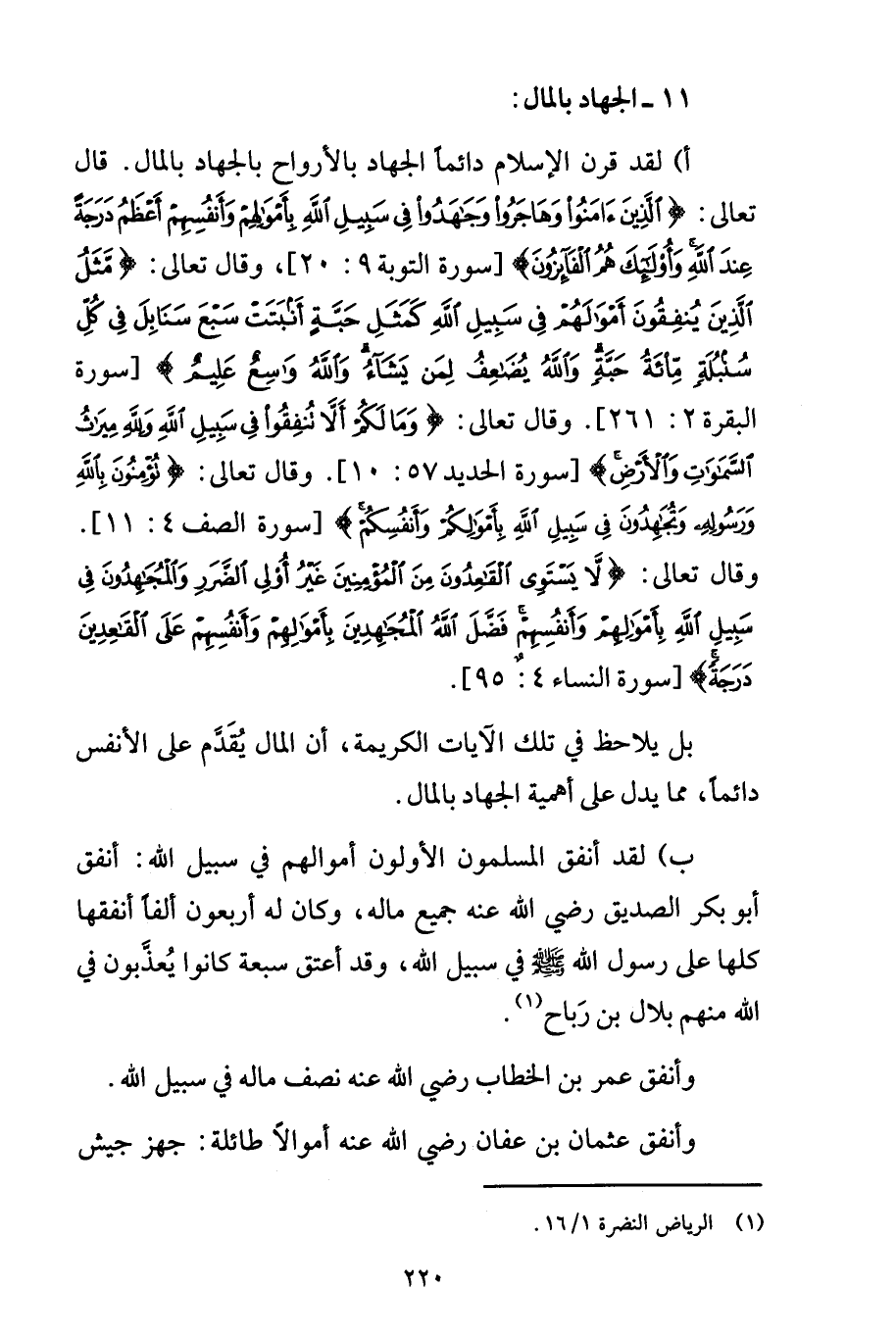 أ) لقد قرن الإسلام دائماً الجهاد بالأرواح بالجهاد بالمال. قال تعالى: {الَّذِينَ آمَنُواْ وَهَاجَرُواْ وَجَاهَدُواْ فِي سَبِيلِ اللَّهِ بِأَمْوَالِهِمْ وَأَنفُسِهِمْ أَعْظَمُ دَرَجَةً عِندَ اللَّهِ وَأُوْلَئِكَ هُمُ الْفَائِزُونَ} [سورة التوبة 9: 20]، وقال تعالى: {مَّثَلُ الَّذِينَ يُنفِقُونَ أَمْوَالَهُمْ فِي سَبِيلِ اللَّهِ كَمَثَلِ حَبَّةٍ أَنبَتَتْ سَبْعَ سَنَابِلَ فِي كُلِّ سُنبُلَةٍ مِّئَةُ حَبَّةٍ وَاللَّهُ يُضَاعِفُ لِمَن يَشَاءُ وَاللَّهُ وَاسِعٌ عَلِيمٌ} [سورة البقرة 2: 261]. وقال تعالى: {وَمَا لَكُمْ أَلَّا تُنفِقُوا فِي سَبِيلِ اللَّهِ وَلِلَّهِ مِيرَاثُ السَّمَاوَاتِ وَالْأَرْضِ} [سورة الحديد 57: 10]. وقال تعالى: {تُؤْمِنُونَ بِاللَّهِ وَرَسُولِهِ وَتُجَاهِدُونَ فِي سَبِيلِ اللَّهِ بِأَمْوَالِكُمْ وَأَنفُسِكُمْ} [سورة الصف 4: 11].