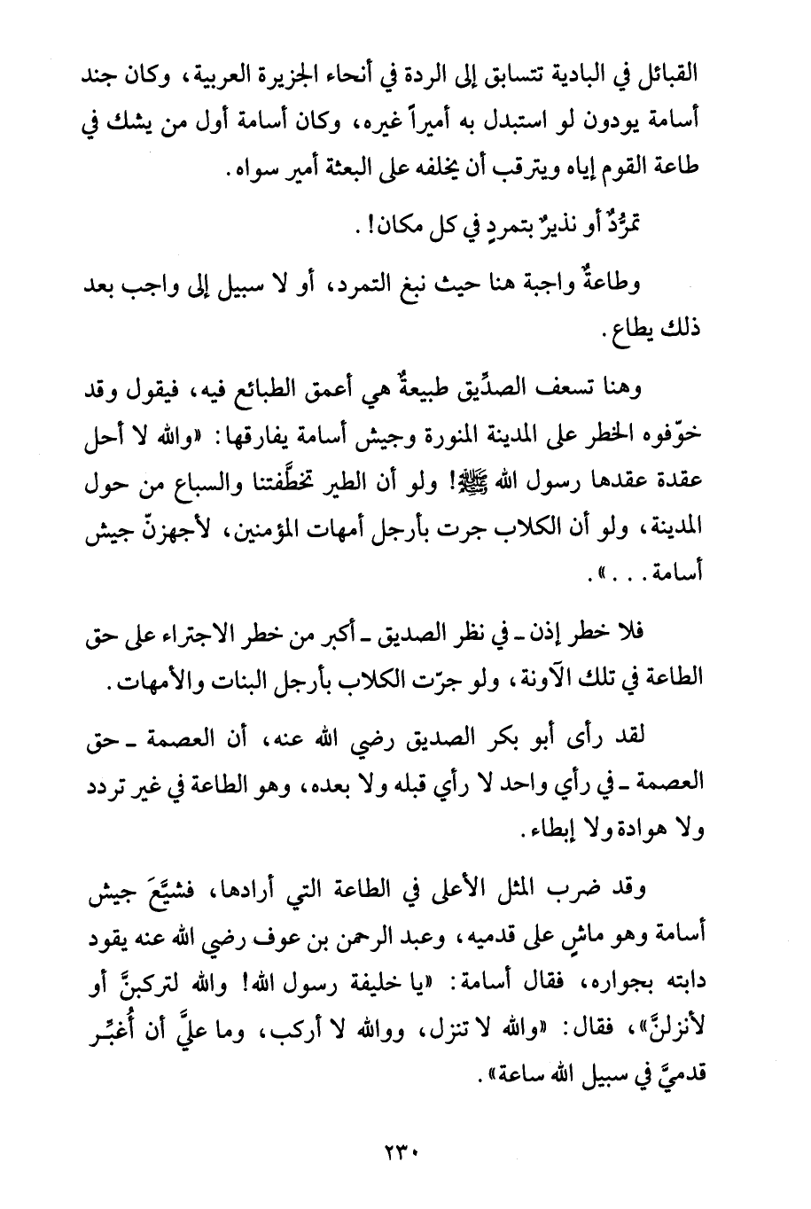 وطاعةٌ واجبة هنا حيث نبغ التمرد، أو لا سبيل إلى واجب بعد ذلك يطاع. وهنا تسعف الصدِّيق طبيعةٌ هي أعمق الطبائع فيه، فيقول وقد خوّفوه الخطر على المدينة المنورة وجيش أسامة يفارقها: "والله لا أحل عقدة عقدها رسول الله - صلى الله عليه وسلم -! ولو أن الطير تخطَّفتنا والسباع من حول المدينة، ولو أن الكلاب جرت بأرجل أمهات المؤمنين، لأجهزنّ جيش أسامة ... ".