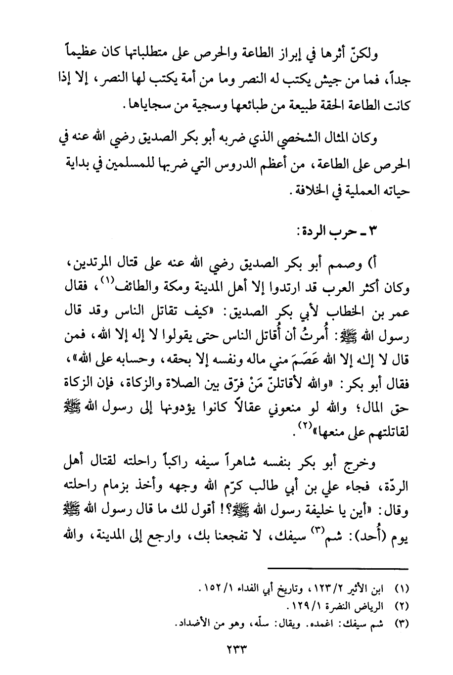 ولكنّ أثرها في إبراز الطاعة والحرص على متطلباتها كان عظيماً جداً، فما من جيش يكتب له النصر وما من أمة يكتب لها النصر، إلا إذا كانت الطاعة الحقة طبيعة من طبائعها وسجية من سجاياها. وكان المثال الشخصي الذي ضربه أبو بكر الصديق - رضي الله عنه - في الحرص على الطاعة، من أعظم الدروس التي ضربها للمسلمين في بداية حياته العملية في الخلافة.