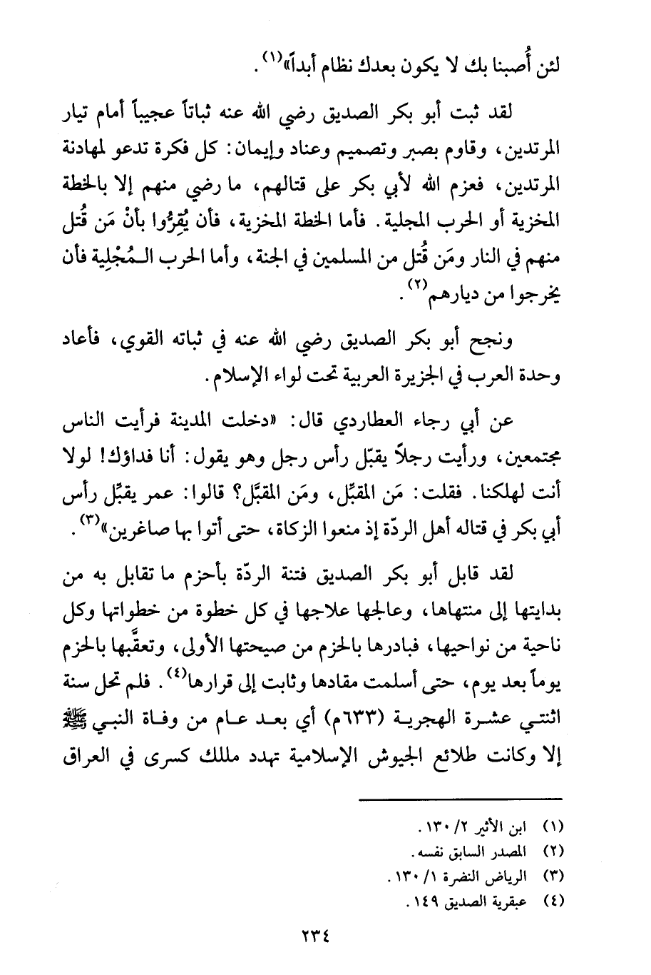 لقد قابل أبو بكر الصديق فتنة الردّة بأحزم ما تقابل به من بدايتها إلى منتهاها، وعالجها علاجها في كل خطوة من خطواتها وكل ناحية من نواحيها، فبادرها بالحزم من صيحتها الأولى، وتعقَّبها بالحزم يوماً بعد يوم، حتى أسلمت مقادها وثابت إلى قرارها (4). فلم تحل سنة اثنتي عشرة الهجرية (633 م) أي بعد عام من وفاة النبي - صلى الله عليه وسلم - إلا وكانت طلائع الجيوش الإسلامية تهدد ملك كسرى في العراق