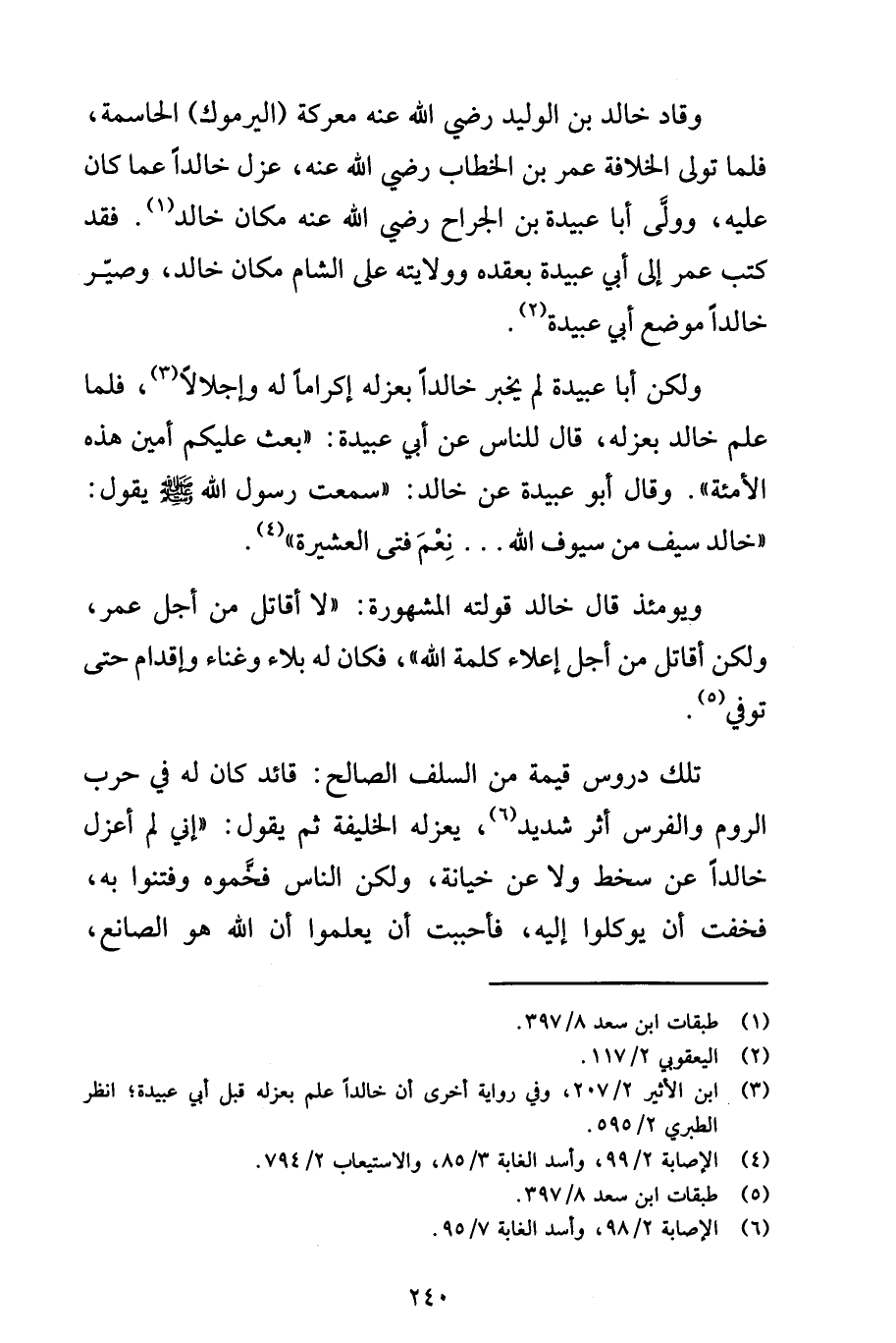 تلك دروس قيمة من السلف الصالح: قائد كان له في حرب الروم والفرس أثر شديد (6)، يعزله الخليفة ثم يقول: "إني لم أعزل خالداً عن سخط ولا عن خيانة، ولكن الناس فخَّموه وفُتنوا به، فخفت أن يوكلوا إليه، فأحببت أن يعلموا أن الله هو الصانع،