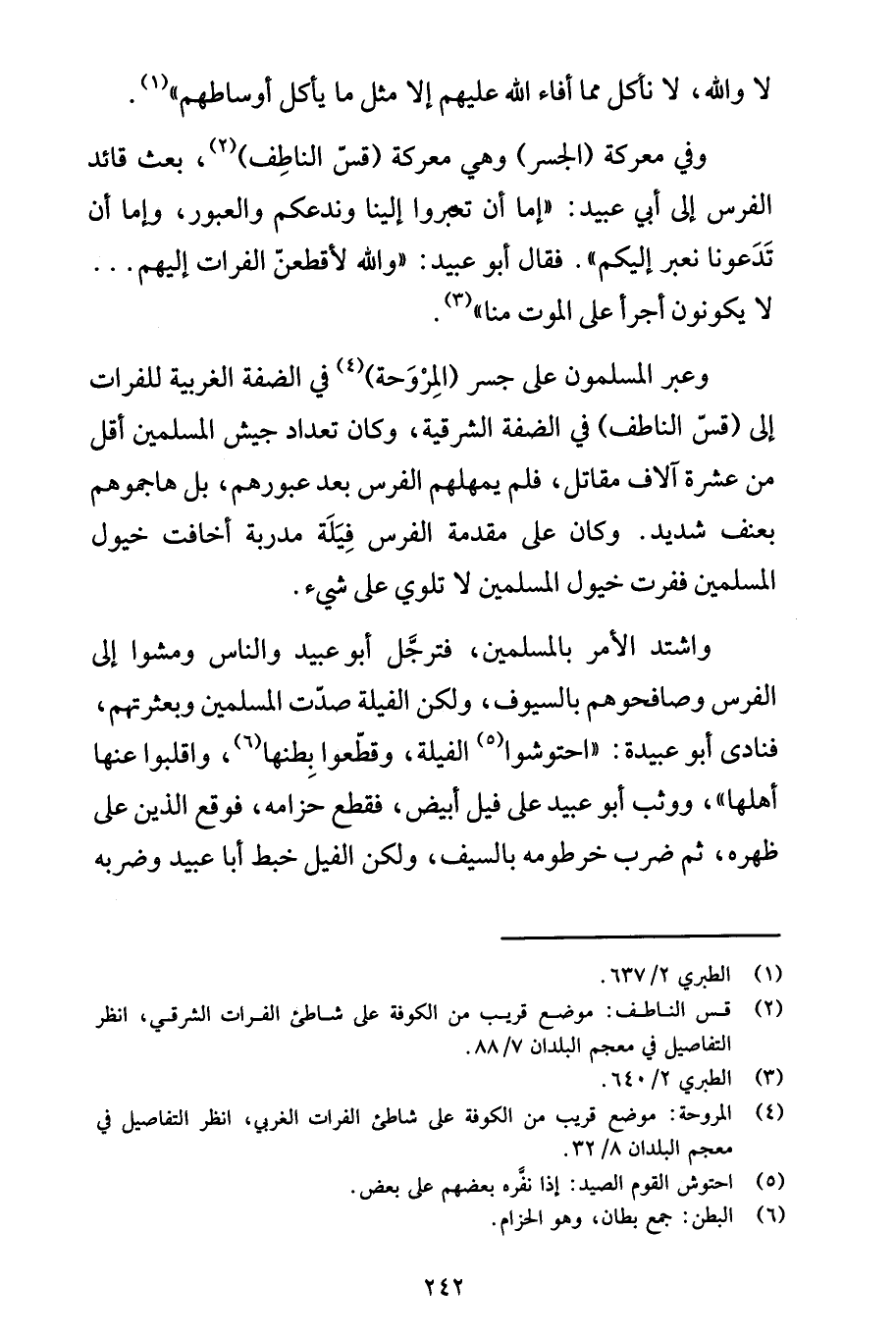 لا والله، لا نأكل مما أفاء الله عليهم إلا مثل ما يأكل أوساطهم" (1). وفي معركة (الجسر) وهي معركة (قسّ الناطِف) (2)، بعث قائد الفرس إلى أبي عبيد: "إما أن تعبروا إلينا ونَدَعكم والعبور، وإما أن تَدَعونا نعبر إليكم". فقال أبو عبيد: "والله لأقطعنّ الفرات إليهم ... لا يكونون أجرأ على الموت منا" (3).