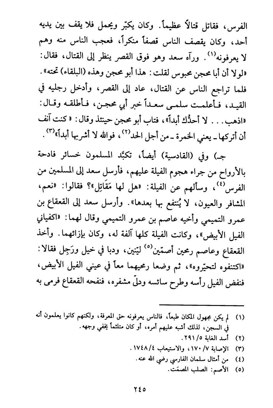 الفرس، فقاتل قتالاً عظيماً. وكان يكبّر ويحمل فلا يقف بين يديه أحد، وكان يقصف الناس قصفاً منكراً، فعجب الناس منه وهم لا يعرفونه (1). ورآه سعد وهو فوق القصر ينظر إلى القتال، فقال: "لولا أن أبا محجن محبوس لقلت: هذا أبو محجن وهذه (البلقاء) تحته".
