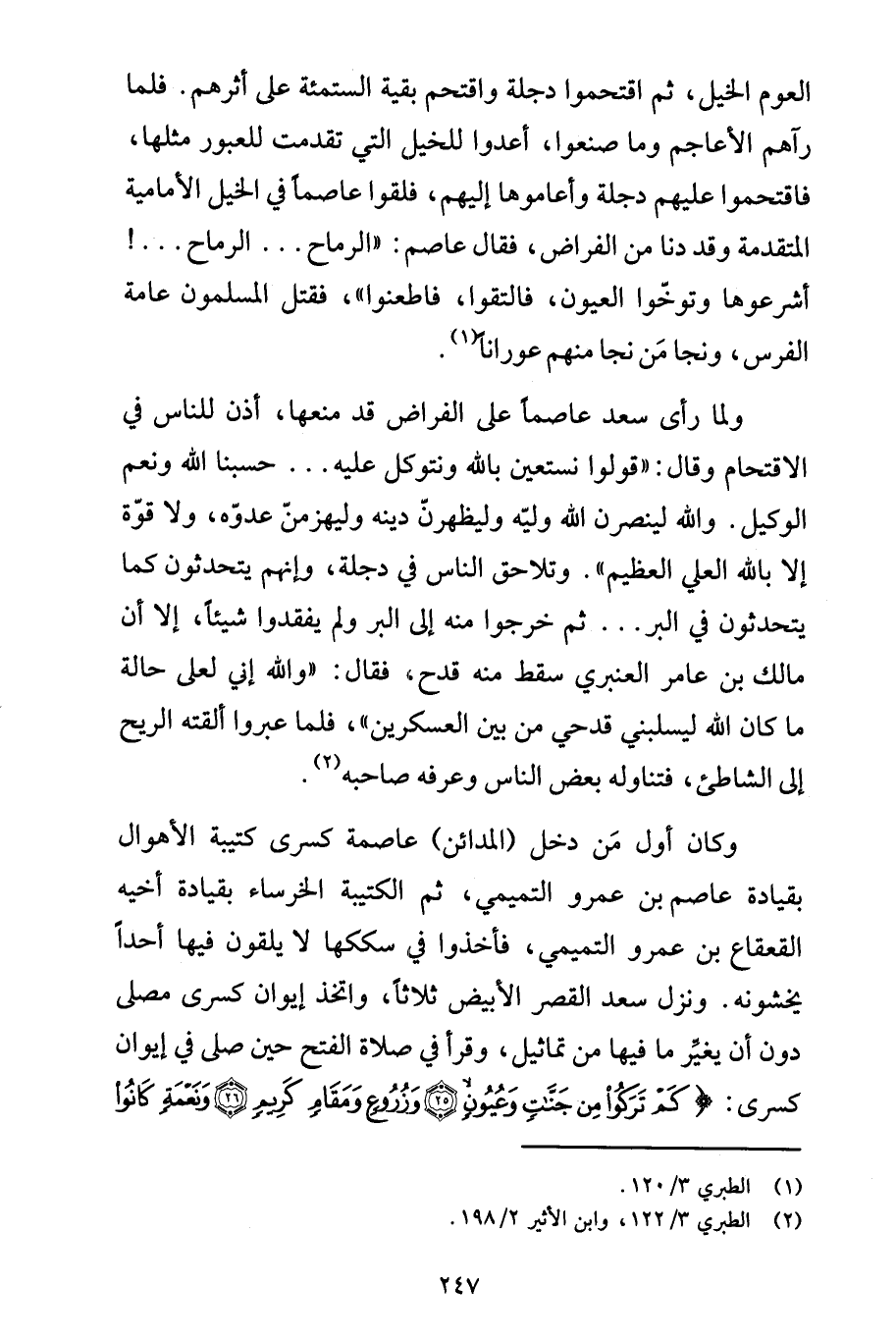 ولما رأى سعد عاصماً على الفراض قد منعها، أذن للناس في الاقتحام وقال: "قولوا نستعين بالله ونتوكل عليه ... حسبنا الله ونعم الوكيل. والله لينصرن الله وليّه وليظهرنّ دينه وليهزمنّ عدوّه، ولا قوّة إلا بالله العلي العظيم". وتلاحق الناس فى دجلة، وإنهم يتحدثون كما يتحدثون في البر ... ثم خرجوا منه إلى البر ولم يفقدوا شيئاً، إلا أن مالك بن عامر العنبري سقط منه قدح، فقال: "والله إني لعلى حالة ما كان الله ليسلبني قدحي من بين العسكرين"، فلما عبروا ألقته الريح إلى الشاطئ، فتناوله بعض الناس وعرفه صاحبه (2).
