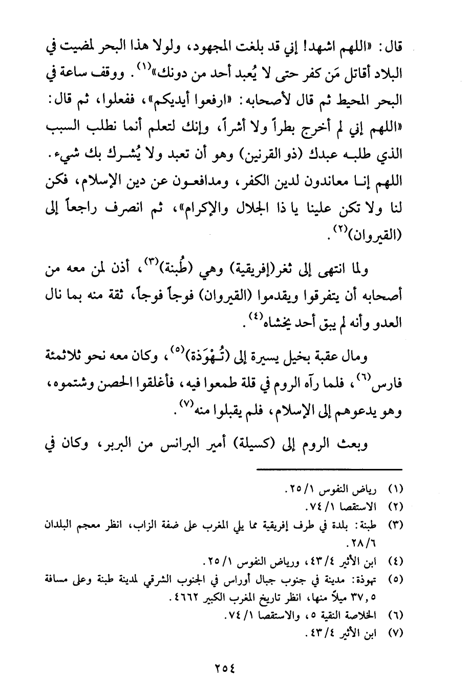 قال: "اللهم اشهد! إني قد بلغت المجهود، ولولا هذا البحر لمضيت في البلاد أقاتل مَن كفر حتى لا يُعبد أحد من دونك" (1). ووقف ساعة في البحر المحيط ثم قال لأصحابه: "ارفعوا أيديكم"، ففعلوا، ثم قال: "اللهم إني لم أخرج بطراً ولا أشراً، وإنك لتعلم أنما نطلب السبب الذي طلبه عبدك (ذو القرنين) وهو أن تعبد ولا يُشرك بك شيء. اللهم إنا معاندون لدين الكفر، ومدافعون عن دين الإسلام، فكن لنا ولا تكن علينا يا ذا الجلال والإكرام"، ثم انصرف راجعاً إلى (القيروان) (2).
