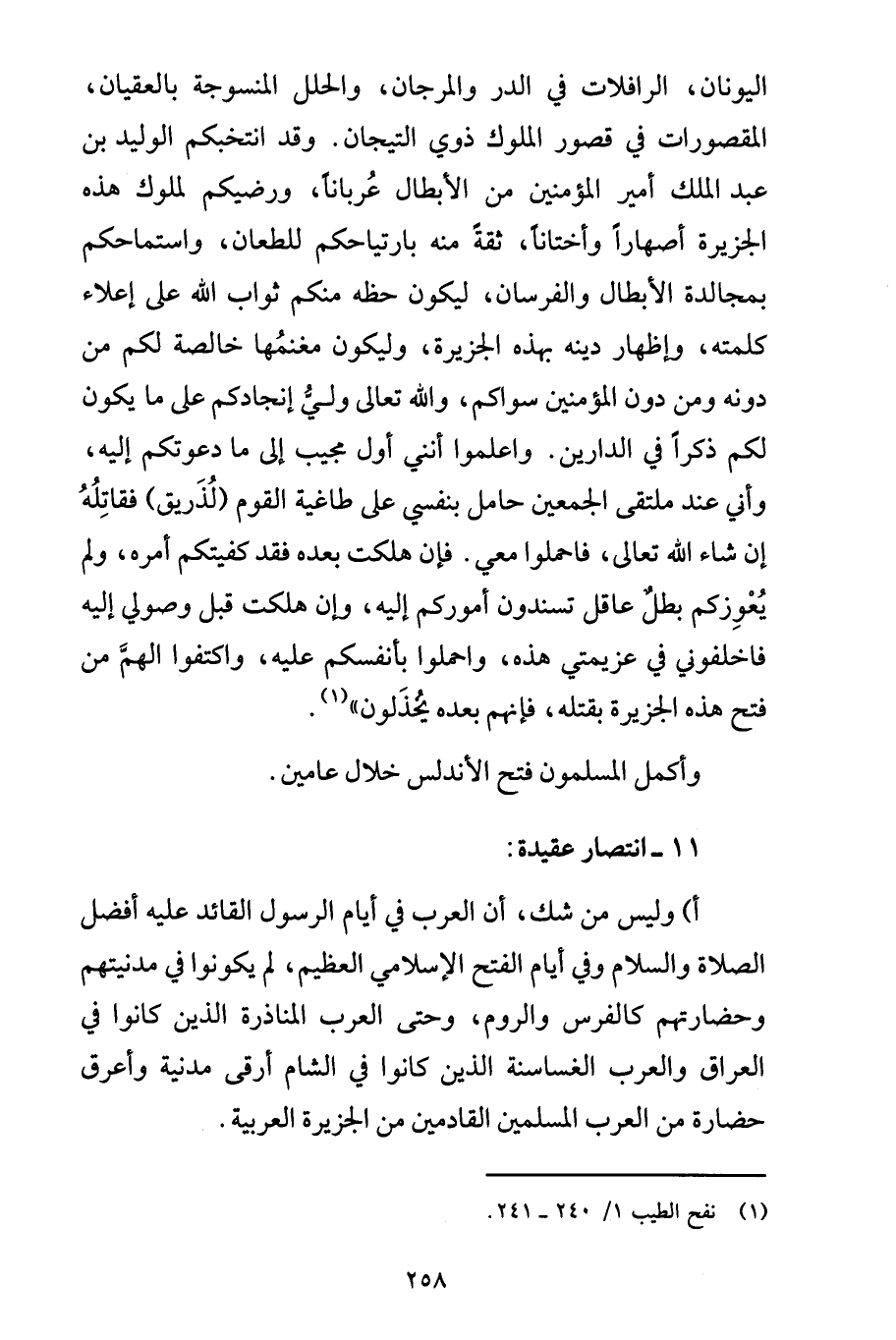 أ) وليس من شك، أن العرب في أيام الرسول القائد عليه أفضل الصلاة والسلام وفي أيام الفتح الإسلامي العظيم، لم يكونوا في مدنيتهم وحضارتهم كالفرس والروم، وحتى العرب المناذرة الذين كانوا في العراق والعرب الغساسنة الذين كانوا في الشام أرقى مدنية وأعرق حضارة من العرب المسلمين القادمين من الجزيرة العربية.