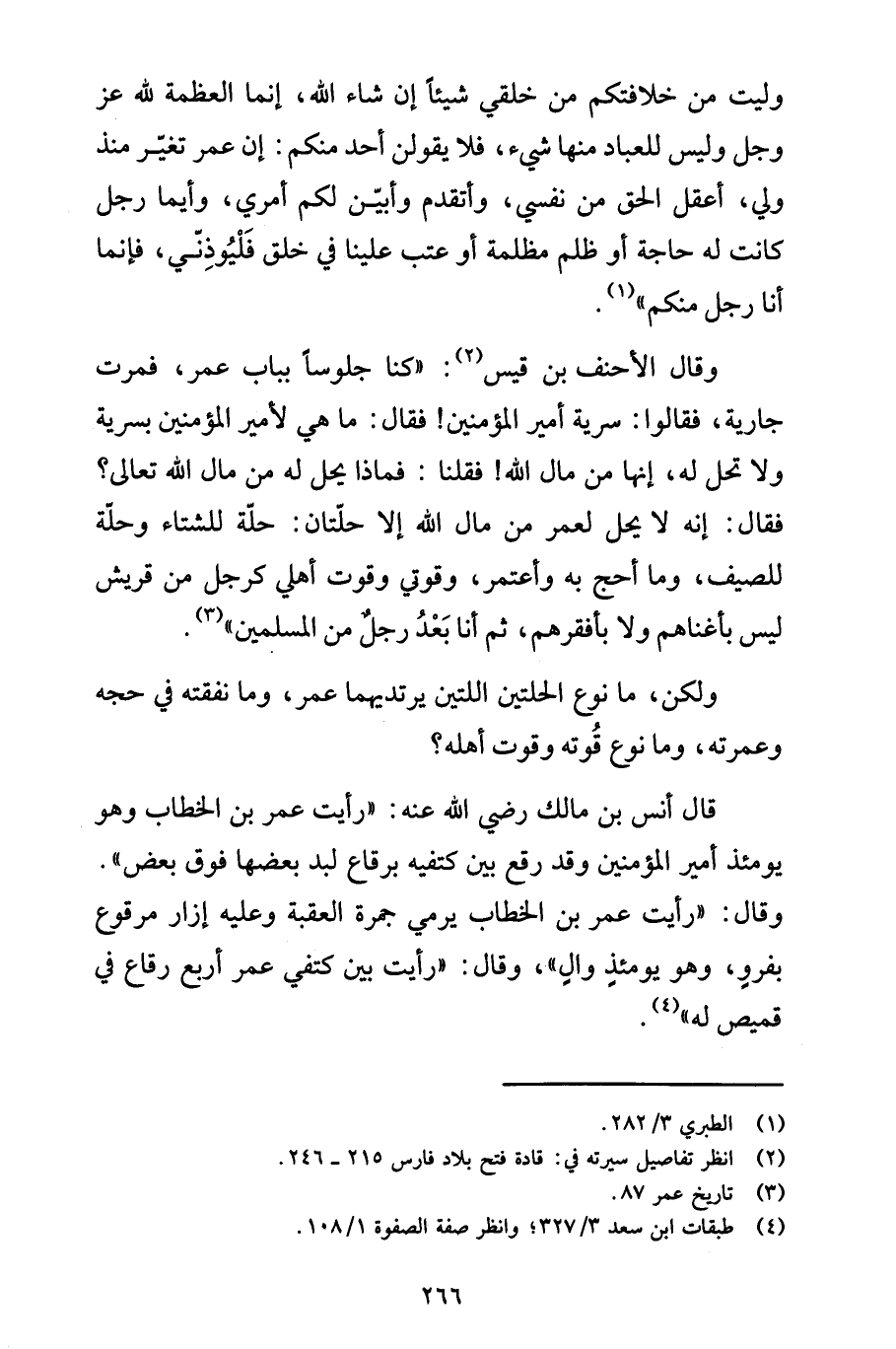 وقال الأحنف بن قيس (2): "كنا جلوساً بباب عمر، فمرت جارية، فقالوا: سرية أمير المؤمنين! فقال: ما هي لأمير المؤمنين بسرية ولا تحل له، إنها من مال الله! فقلنا: فماذا يحل له من مال الله تعالى؟ فقال: إنه لا يحل لعمر من مال الله إلا حلّتان: حلّة للشتاء وحلّة للصيف، وما أحج به وأعتمر، وقوتي وقوت أهلي كرجل من قريش ليس بأغناهم ولا بأفقرهم، ثم أنا بَعْدُ رجل من المسلمين" (3).