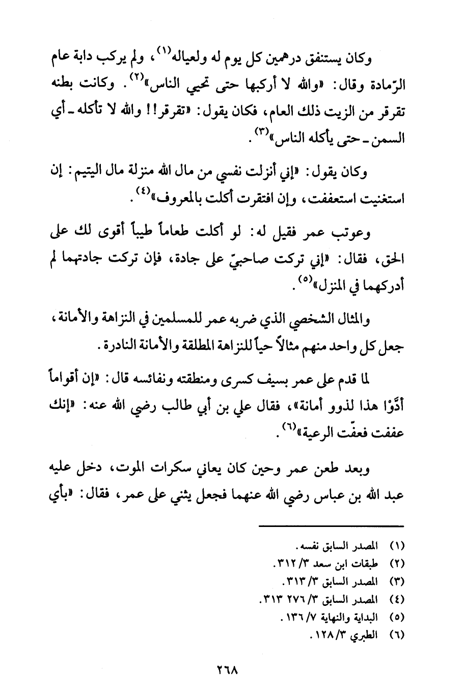 وكان يستنفق درهمين كل يوم له ولعياله (1)، ولم يركب دابة عام الرّمادة وقال: "والله لا أركبها حتى تحيي الناس" (2). وكانت بطنه تقرقر من الزيت ذلك العام، فكان يقول: "تقرقر!! والله لا تأكله - أي السمن- حتى يأكله الناس" (3).