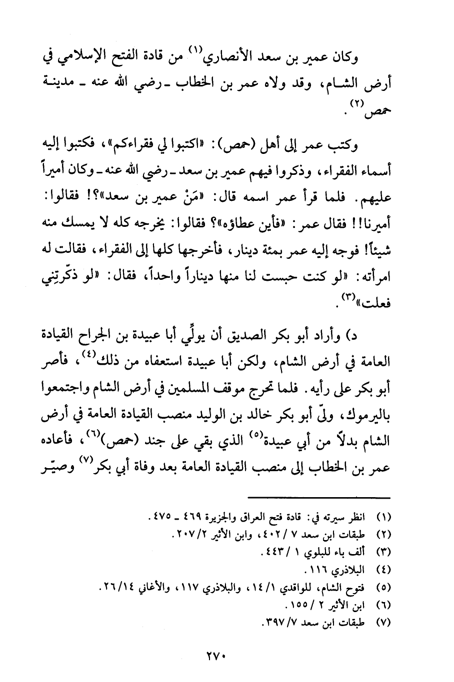 د) وأراد أبو بكر الصديق أن يولِّي أبا عبيدة بن الجراح القيادة العامة في أرض الشام، ولكن أبا عبيدة استعفاه من ذلك (4)، فأصر أبو بكر على رأيه. فلما تحرج موقف المسلمين في أرض الشام واجتمعوا باليرموك، ولىّ أبو بكر خالد بن الوليد منصب القيادة العامة في أرض الشام بدلاً من أبي عبيدة (5) الذي بقي على جند (حمص) (6)، فأعاده عمر بن الخطاب إلى منصب القيادة العامة بعد وفاة أبي بكر (7) وصيّر