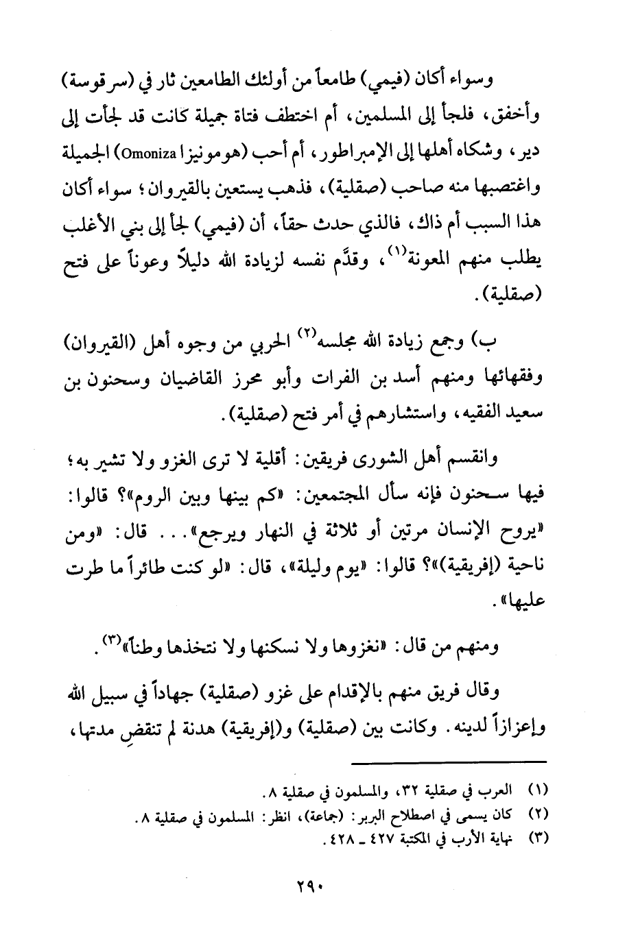 ب) وجمع زيادة الله مجلسه (2) الحربي من وجوه أهل (القيروان) وفقهائها ومنهم أسد بن الفرات وأبو محرز القاضيان وسحنون بن سعيد الفقيه، واستشارهم في أمر فتح (صقلية).
