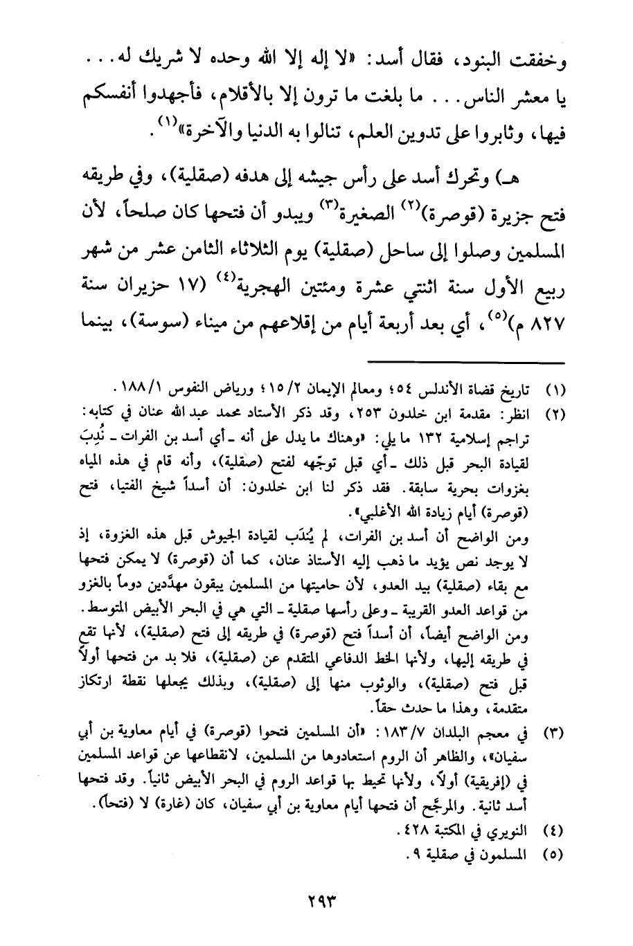 (2) انظر: مقدمة ابن خلدون 253، وقد ذكر الأستاذ محمد عبد الله عنان في كتابه: تراجم إسلامية 132 ما يلي: "وهناك ما يدل على أنه - أي أسد بن الفرات - نُدِبَ لقيادة البحر قبل ذلك - أي قبل توجّهه لفتح (صقلية)، وأنه قام في هذه المياه بغزوات بحرية سابقة. فقد ذكر لنا ابن خلدون: أن أسداً شيخ الفتيا، فتح (قوصرة) أيام زيادة الله الأغلبي".