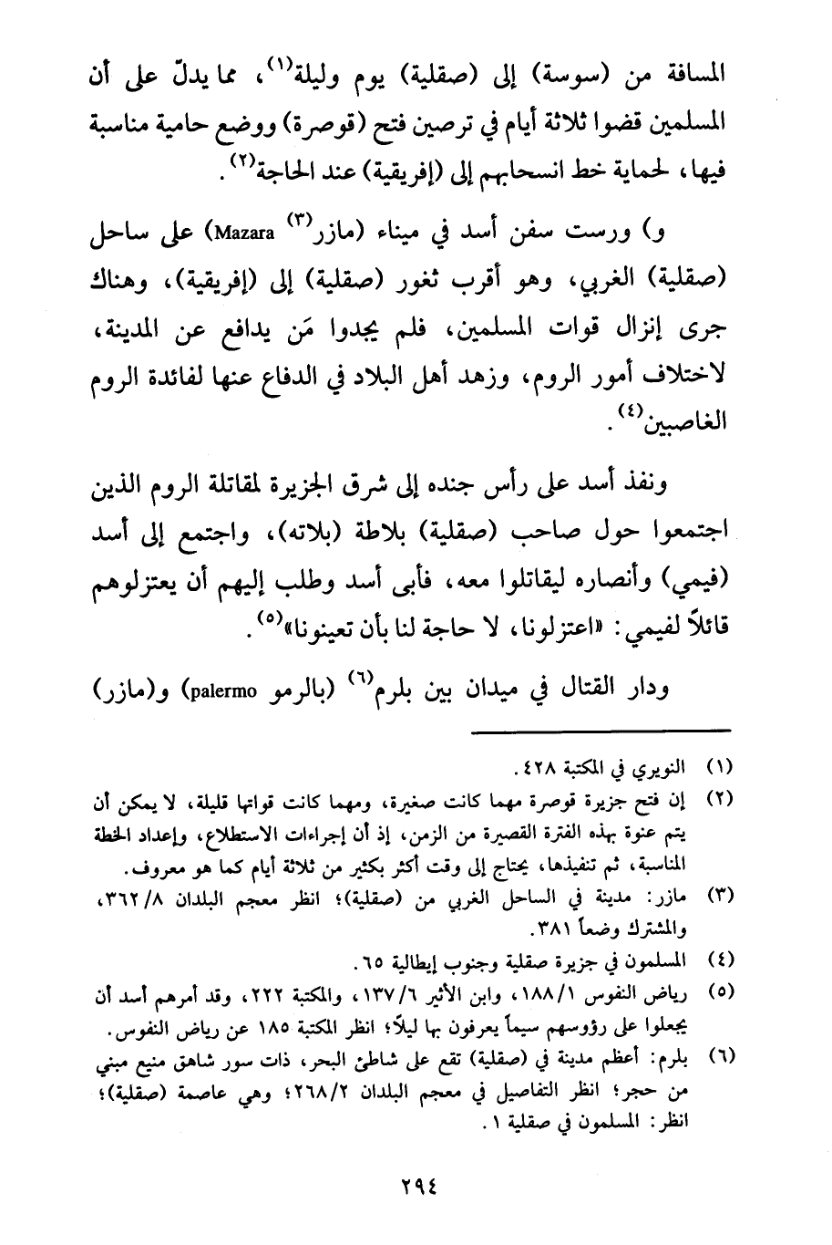 (6) بلرم: أعظم مدينة في (صقلية) تقع على شاطئ البحر، ذات سور شاهق منيع مبني من حجر؛ انظر التفاصيل في معجم البلدان 2/ 268؛ وهي عاصمة (صقلية)؛ انظر: المسلمون في صقلية 1.
