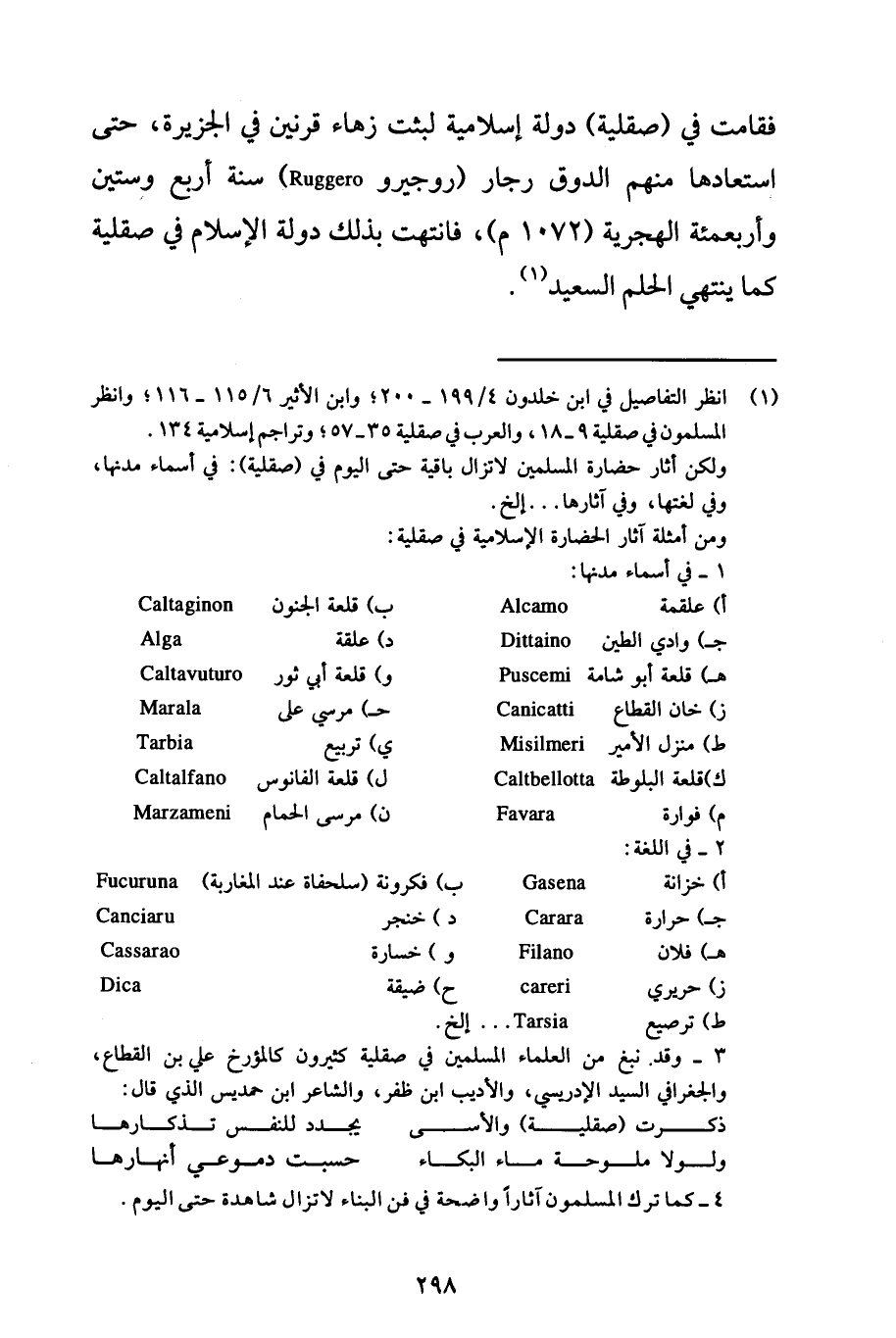 (1) انظر التفاصيل في ابن خلدون 4/ 199 - 200؛ وابن الأثير 6/ 115 - 116؛ وانظر المسلمون في صقلية 9 - 18، والعرب في صقلية 35 - 57؛ وتراجم إسلامية 134. ولكن آثار حضارة المسلمين لا تزال باقية حتى اليوم في (صقلية): في أسماء مدنها، وفي لغتها، وفي آثارها ... إلخ.