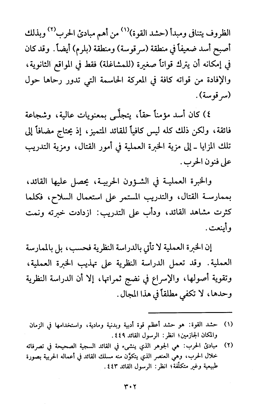 (2) مبادئ الحرب: هي الجوهر الذي ينشىء في القائد السجية الصحيحة في تصرفاته خلال الحرب، وهي العنصر الذي يتكوَّن منه مسلك القائد في أعماله الحربية بصورة طبيعية وغير متكلّفة؛ انظر: الرسول القائد 443.