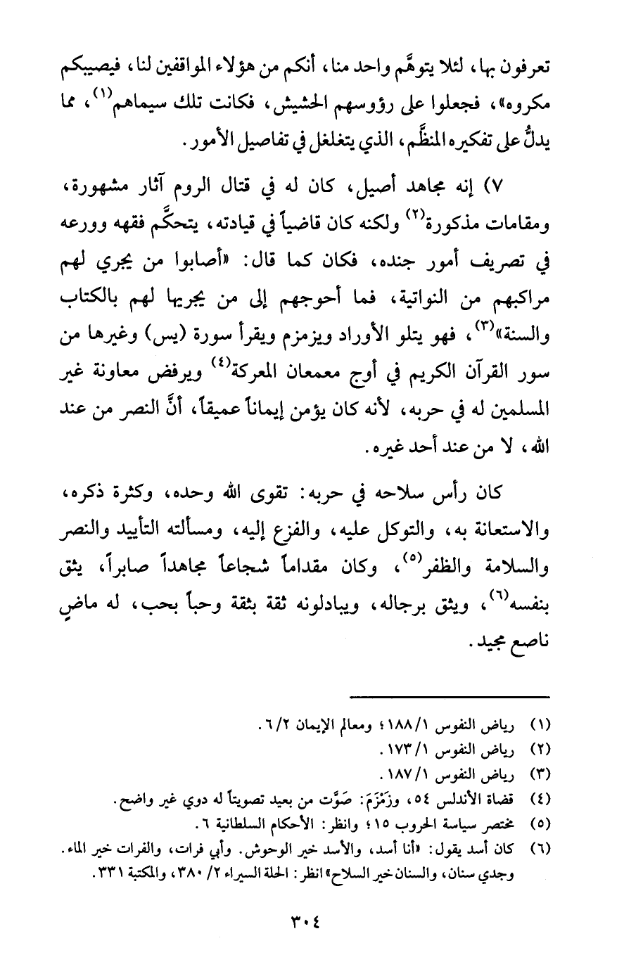 7) إنه مجاهد أصيل، كان له في قتال الروم آثار مشهورة، ومقامات مذكورة (2) ولكنه كان قاضياً في قيادته، يتحكَّم فقهه وورعه في تصريف أمور جنده، فكان كما قال: "أصابوا من يجري لهم مراكبهم من النواتية، فما أحوجهم إلى من يجريها لهم بالكتاب والسنة" (3)، فهو يتلو الأوراد ويزمزم ويقرأ سورة (يس) وغيرها من سور القرآن الكريم في أوج معمعان المعركة (4) ويرفض معاونة غير المسلمين له في حربه، لأنه كان يؤمن إيماناً عميقاً، أنَّ النصر من عند الله، لا من عند أحد غيره.