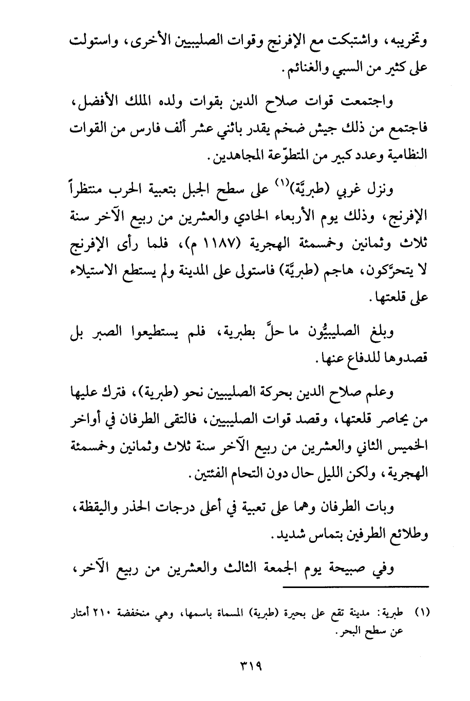 ونزل غربي (طبريَّة) (1) على سطح الجبل بتعبية الحرب منتظراً الإفرنج، وذلك يوم الأربعاء الحادي والعشرين من ربيع الآخر سنة ثلاث وثمانين وخمسمئة الهجرية (1187م)، فلما رأى الإفرنج لا يتحرَّكون، هاجم (طبريَّة) فاستولى على المدينة ولم يستطع الاستيلاء على قلعتها.