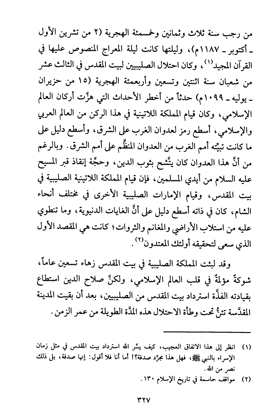 من رجب سنة ثلاث وثمانين وخمسمئة الهجرية (2 من تشرين الأول - أكتوبر - 1187م)، وليلتها كانت ليلة المعراج المنصوص عليها في القرآن المجيد (1)، وكان احتلال الصليبيين لبيت المقدس في الثالث عشر من شعبان سنة اثنتين وتسعين وأربعمئة الهجرية (15 من حزيران - يوليه - 1099م) حدثاً من أخطر الأحداث التي هزت أركان العالم الإسلامي، وكان قيام المملكة اللاتينية في هذا الركن من العالم العربي والإسلامي، أسطع رمز لعدوان الغرب على الشرق، وأسطع دليل على ما كانت تبيِّته أمم الغرب من العدوان المنظَّم على أمم الشرق. وبالرغم من أنَّ هذا العدوان كان يتَّشح بثوب الدين، وحجَّة إنقاذ قبر المسيح عليه السلام من أيدي المسلمين، فإن قيام المملكة اللاتينية الصليبية في بيت المقدس، وقيام الإمارات الصليبية الأخرى في مختلف أنحاء الشام، كان في ذاته أسطع دليل على أنَّ الغايات الدنيوية، وما تنطوي عليه من استلاب الأراضي والمغانم والثروات؛ كانت هي المقصد الأول الذي سعى لتحقيقه أولئك المعتدون (2).