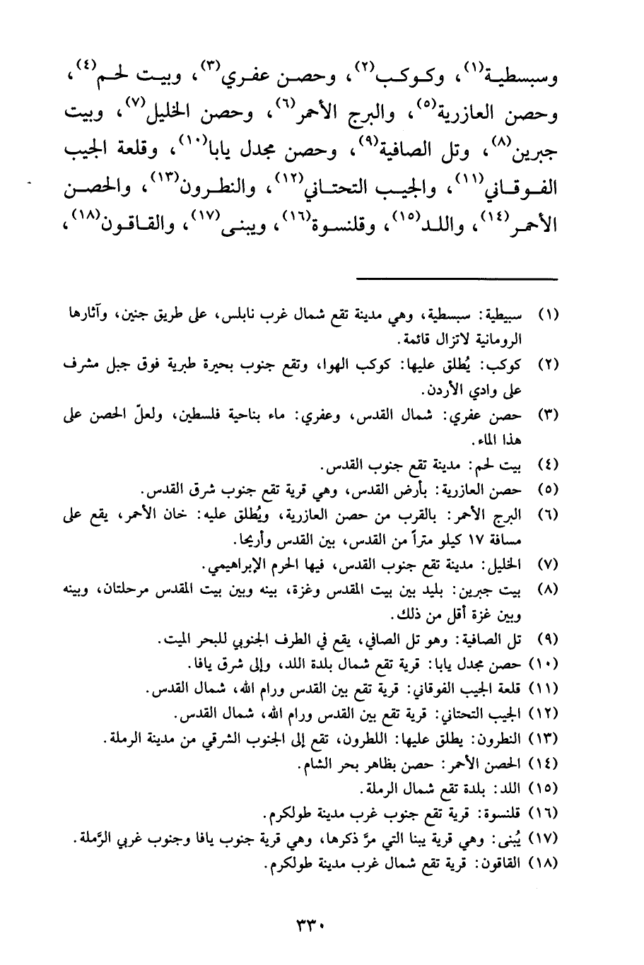 وسبسطية (1)، وكوكب (2)، وحصن عفري (3)، وبيت لحم (4)، وحصن العازرية (5)، والبرج الأحمر (6)، وحصن الخليل (7)، وبيت جبرين (8)، وتل الصافية (9)، وحصن مجدل يابا (1)، وقلعة الجيب الفوقاني (11)، والجيب التحتاني (12)، والنطرون (13)، والحصن الأحمر (14)، واللد (15)، وقلنسوة (16)، ويبنى (17)، والقاقون (18)،