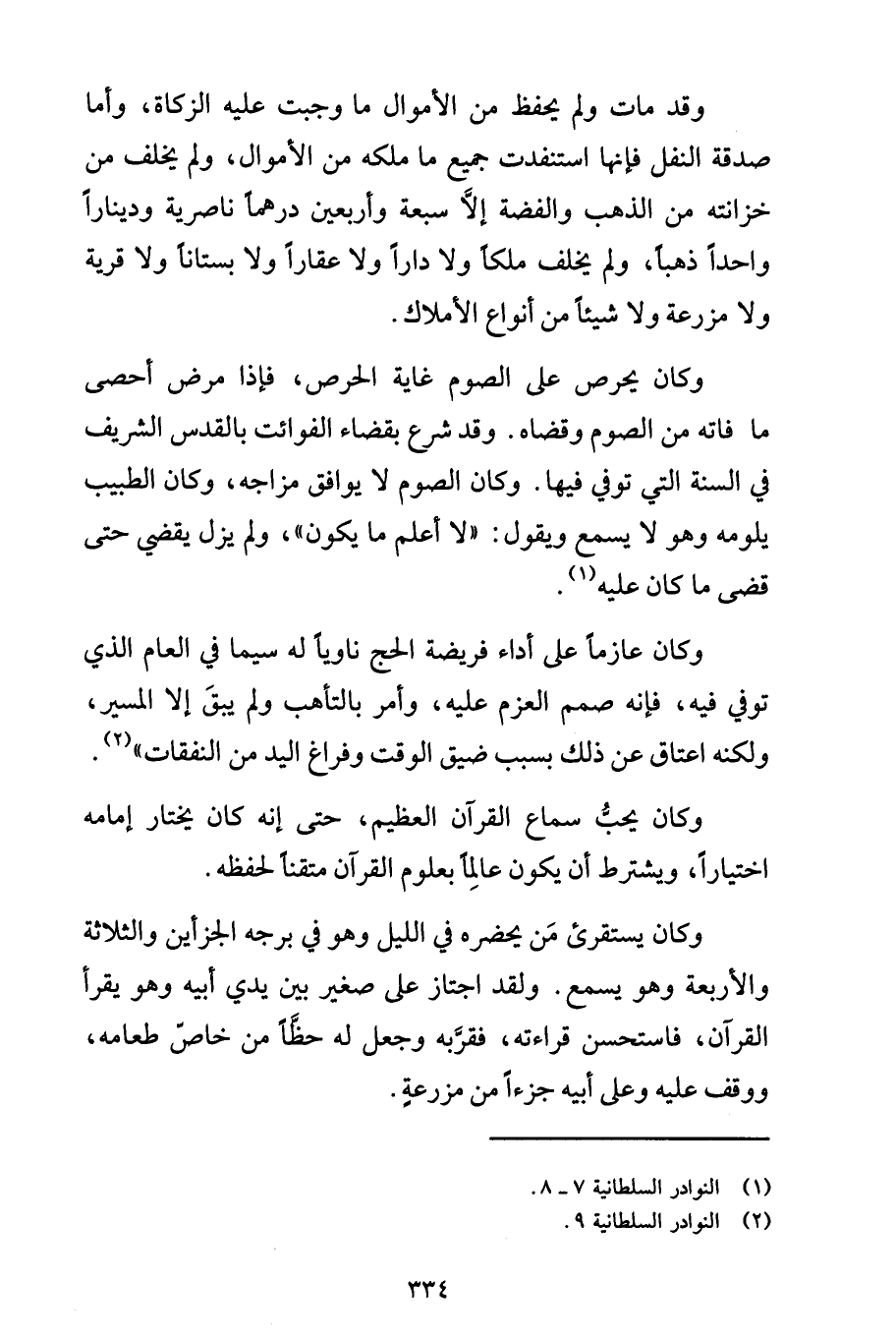 وقد مات ولم يحفظ من الأموال ما وجبت عليه الزكاة، وأما صدقة النفل فإنها استنفدت جميع ما ملكه من الأموال، ولم يخلف من خزانته من الذهب والفضة إلاَّ سبعة وأربعين درهماً ناصرية وديناراً واحداً ذهباً، ولم يخلف ملكاً ولا داراً ولا عقاراً ولا بستاناً ولا قرية ولا مزرعة ولا شيئاً من أنواع الأملاك.