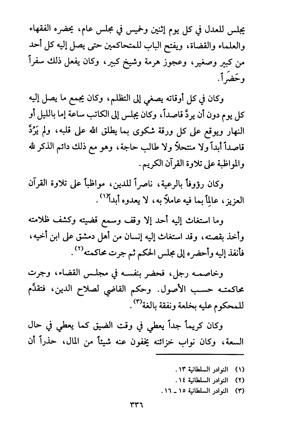 وما استغاث إليه أحد إلا وقف وسمع قضيته وكشف ظلامته وأخذ بقصته، وقد استغاث إليه إنسان من أهل دمشق على ابن أخيه، فأنفذ إليه وأحضره إلى مجلس الحكم ثم جرت محاكمته (2).