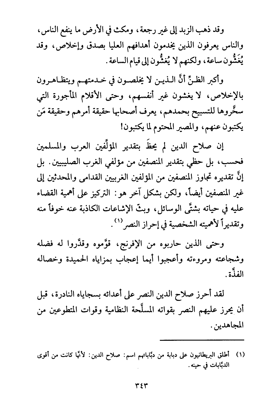 وأكبر الظنِّ أنَّ الذين لا يخلصون في خدمتهم ويتظاهرون بالإخلاص، لا يغشّون غير أنفسهم، وحتى الأقلام المأجورة التي سخَّروها للتسبيح بحمدهم، يعرف أصحابها حقيقة أمرهم وحقيقة مَن يكتبون عنهم، والمصير المحتوم لما يكتبون! إن صلاح الدين لم يحظَ بتقدير المؤلِّفين العرب والمسلمين فحسب، بل حظي بتقدير المنصفين من مؤلفي الغرب الصليبيين. بل إن تقديره تجاوز المنصفين من المؤلفين الغربيين القدامى والمحدثين إلى غير المنصفين أيضاً، ولكن بشكل آخر هو: التركيز على أهمية القضاء عليه في حياته بشتَّى الوسائل، وبثّ الإشاعات الكاذبة عنه خوفاً منه وتقديراً لأهميته الشخصية في إحراز النصر (1).
