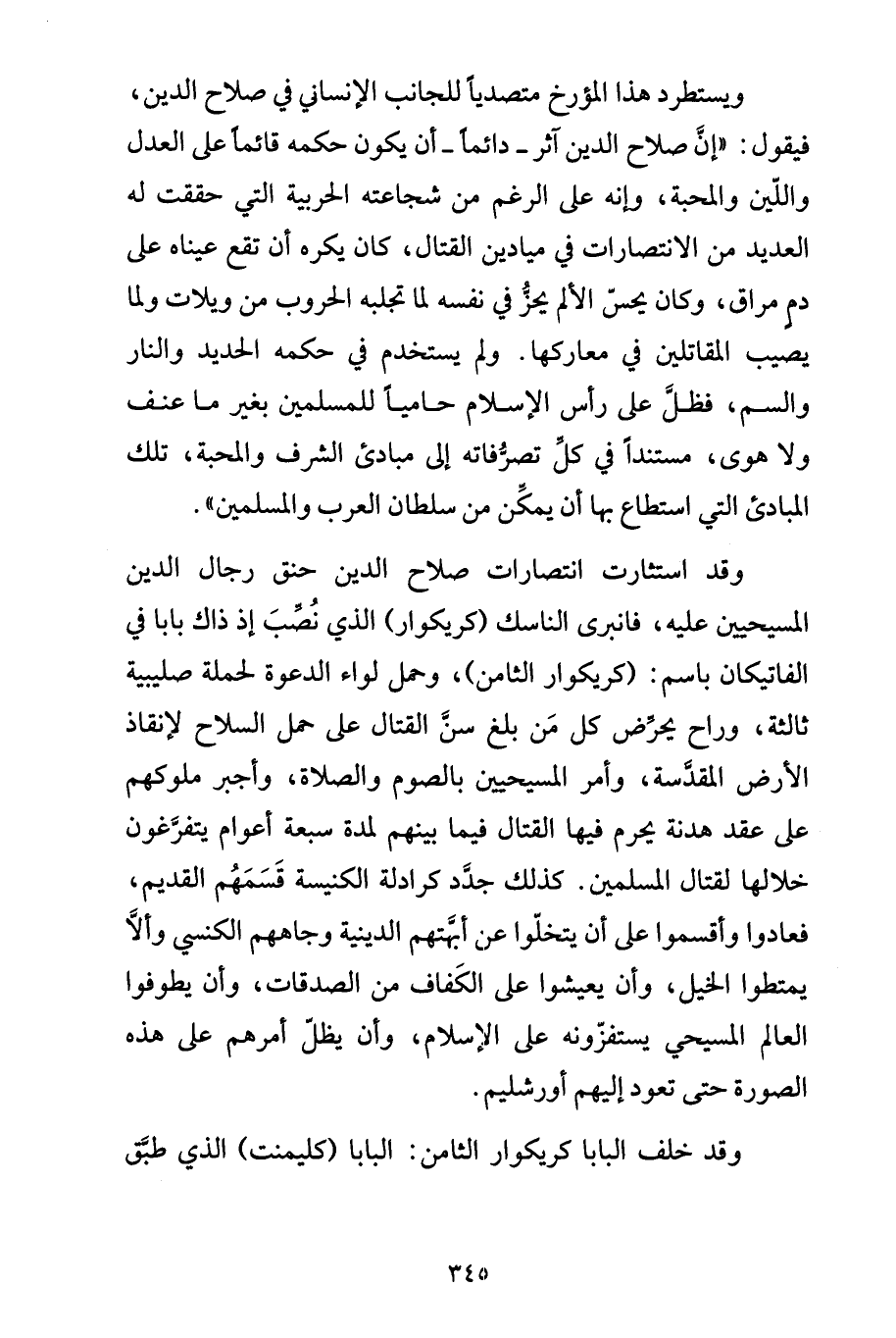 ويستطرد هذا المؤرخ متصدياً للجانب الإنساني في صلاح الدين، فيقول: "إنَّ صلاح الدين آثر -دائماً- أن يكون حكمه قائماً على العدل واللّين والمحبة، وإنه على الرغم من شجاعته الحربية التي حققت له العديد من الانتصارات في ميادين القتال، كان يكره أن تقع عيناه على دمٍ مراق، وكان يحسّ الألم يحزُّ في نفسه لما تجلبه الحروب من ويلات ولما يصيب المقاتلين في معاركها. ولم يستخدم في حكمه الحديد والنار والسم، فظلَّ على رأس الإسلام حامياً للمسلمين بغير ما عنف ولا هوى، مستنداً في كل تصرُّفاته إلى مبادئ الشرف والمحبة، تلك المبادئ التي استطاع بها أن يمكِّن من سلطان العرب والمسلمين".