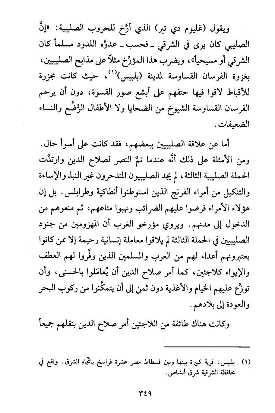 ويقول (غليوم دي تير) الذي أرَّخ للحروب الصليبية: "إن الصليبي كان يرى في الشرقي -فحسب- عدوَّه اللدود مسلماً كان الشرقي أو مسيحياً"، ويضرب هذا المؤرِّخ مثلاً على مذابح الصليبيين، بغزوة الفرسان القساوسة لمدينة (بلبيس) (1)، حيث كانت مجزرة للأقباط لاقوا فيها حتفهم على أبشع صور القسوة، دون أن يرحم الفرسان القساوسة الشيوخ من الضحايا ولا الأطفال الرُّضَّع والنساء الضعيفات.