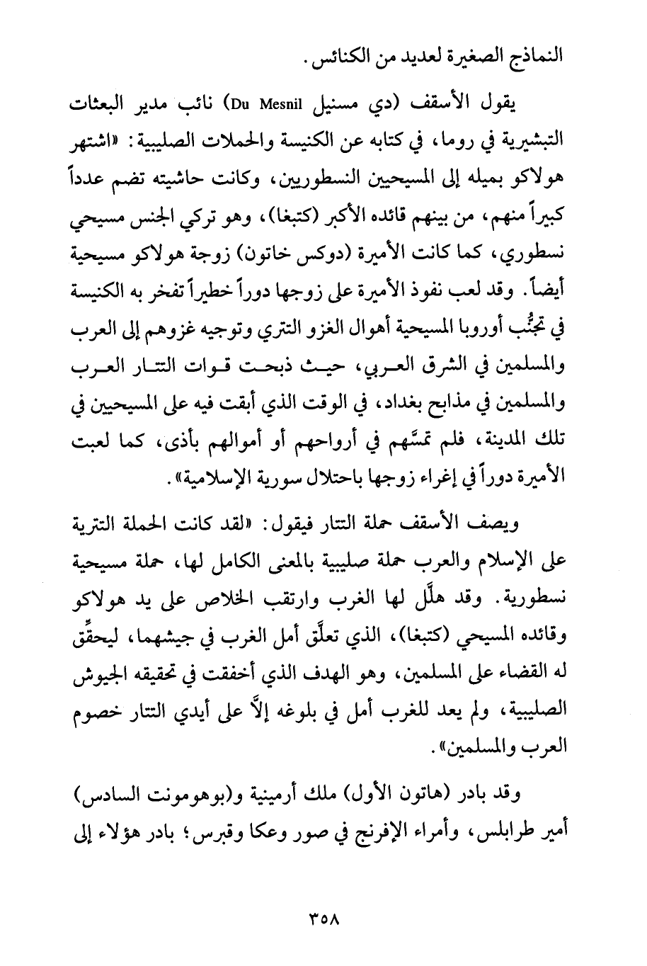 يقول الأسقف (دي مسنيل Du Mesnil) نائب مدير البعثات التبشيرية في روما، في كتابه عن الكنيسة والحملات الصليبية: "اشتهر هولاكو بميله إلى المسيحيين النسطوريين، وكانت حاشيته تضم عدداً كبيراً منهم، من بينهم قائده الأكبر (كتبغا)، وهو تركي الجنس مسيحي نسطوري، كما كانت الأميرة (دوكس خاتون) زوجة هولاكو مسيحية أيضاً. وقد لعب نفوذ الأميرة على زوجها دوراً خطيراً تفخر به الكنيسة في تجنُّب أوروبا المسيحية أهوال الغزو التتري وتوجيه غزوهم إلى العرب والمسلمين في الشرق العربي، حيث ذبحت قوات التتار العرب والمسلمين في مذابح بغداد، في الوقت الذي أبقت فيه على المسيحيين في تلك المدينة، فلم تمسَّهم في أرواحهم أو أموالهم بأذى، كما لعبت الأميرة دوراً في إغراء زوجها باحتلال سورية الإسلامية".