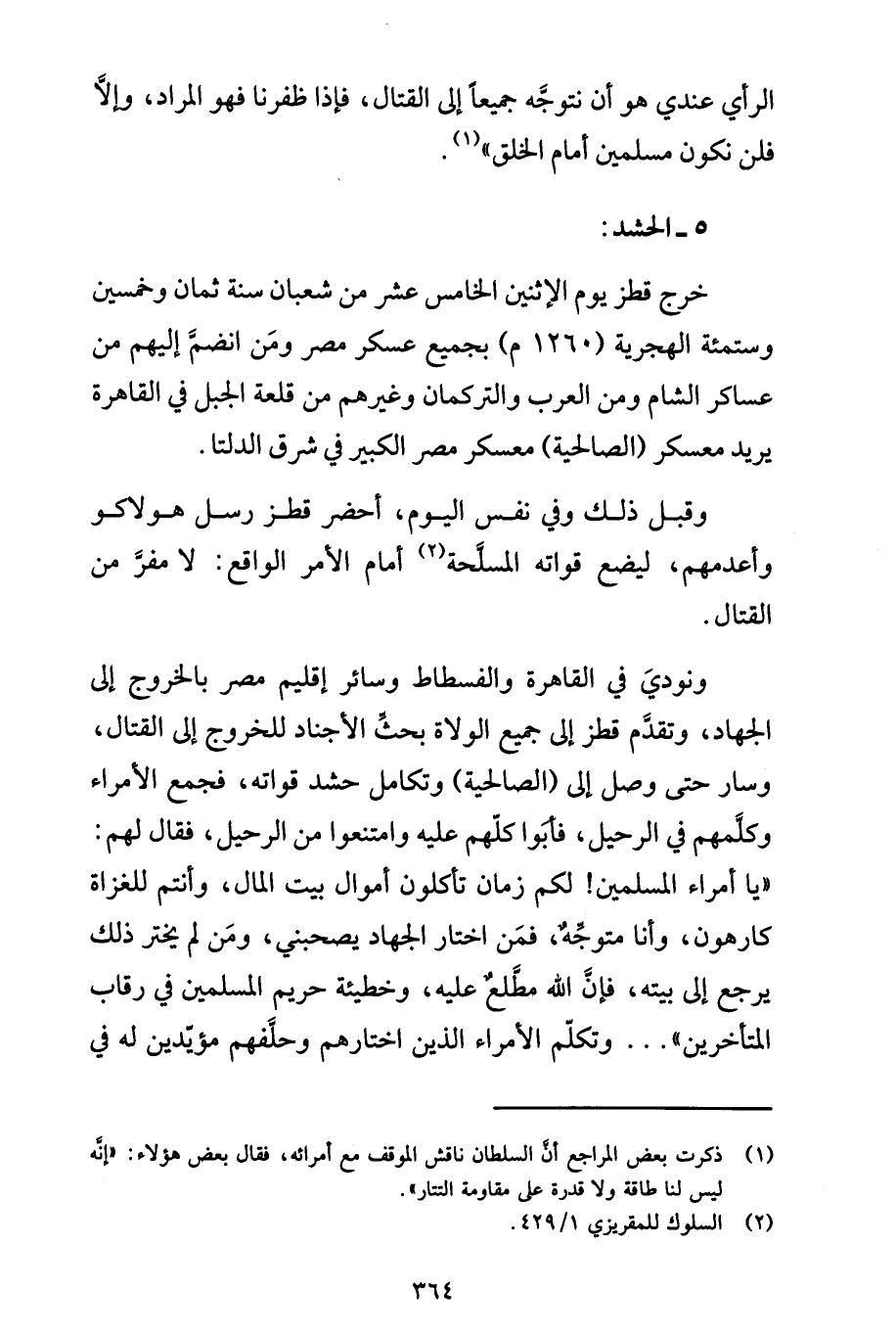(1) ذكرت بعض المراجع أن السلطان ناقش الموقف مع أمرائه، فقال بعض هؤلاء: "إنَّه ليس لنا طاقة ولا قدرة على مقاومة التتار".