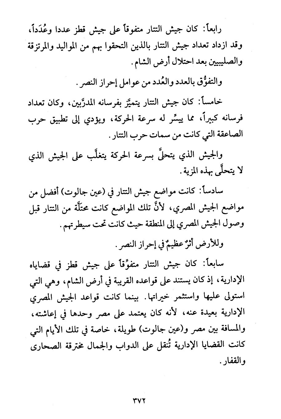 سابعاً: كان جيش التتار متفوِّقاً على جيش قطز في قضاياه الإدارية، إذ كان يستند على قواعده القريبة في أرض الشام، وهي التي استولى عليها واستثمر خيراتها. بينما كانت قواعد الجيش المصري الإدارية بعيدة عنه، لأنه كان يعتمد على مصر وحدها في إعاشته، والمسافة بين مصر و (عين جالوت) طويلة، خاصة في تلك الأيام التي كانت القضايا الإدارية تُنقل على الدواب والجمال مخترقة الصحارى والقفار.