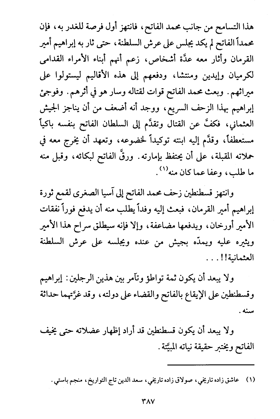 هذا التسامح من جانب محمد الفاتح، فانتهز أول فرصة للغدر به، فإن محمداً الفاتح لم يكد يجلس على عرش السلطنة، حتى ثار به إبراهيم أمير القرمان وأثار معه عدَّة أشخاص، زعم أنهم أبناء الأمراء القدامى لكرميان وإيدين ومنتشا، ودفعهم إلى هذه الأقاليم ليستولوا على ميراثهم. وبعث محمد الفاتح قوات لقتاله وسار هو في أثرهم. وفوجئ إبراهيم بهذا الزحف السريع، ووجد أنه أضعف من أن يناجز الجيش العثماني، فكفَّ عن القتال وتقدَّم إلى السلطان الفاتح بنفسه باكياً مستعطفاً، وقدَّم إليه ابنته توكيداً لخضوعه، وتعهد أن يخرج معه في حملاته المقبلة، على أن يحتفظ بإمارته. ورقَّ الفاتح لبكائه، وقبل منه ما طلب، وعفا عما كان منه (1).