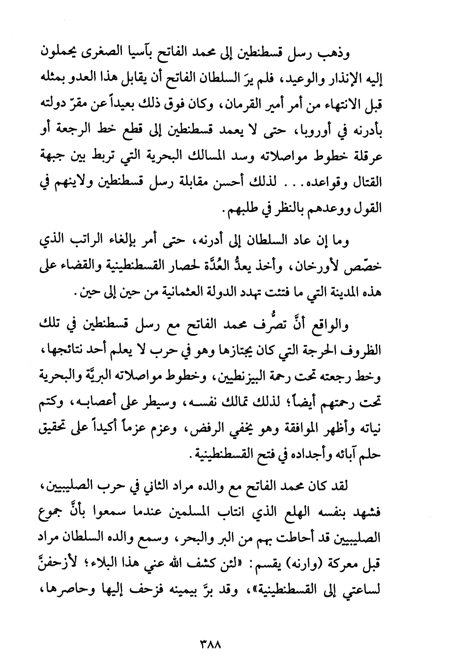 وذهب رسل قسطنطين إلى محمد الفاتح بآسيا الصغرى يحملون إليه الإنذار والوعيد، فلم يرَ السلطان الفاتح أن يقابل هذا العدو بمثله قبل الانتهاء من أمر أمير القرمان، وكان فوق ذلك بعيداً عن مقرّ دولته بأدرنه في أوروبا، حتى لا يعمد قسطنطين إلى قطع خط الرجعة أو عرقلة خطوط مواصلاته وسد المسالك البحرية التي تربط بين جبهة القتال وقواعده ... لذلك أحسن مقابلة رسل قسطنطين ولايَنَهم في القول ووعدهم بالنظر في طلبهم.