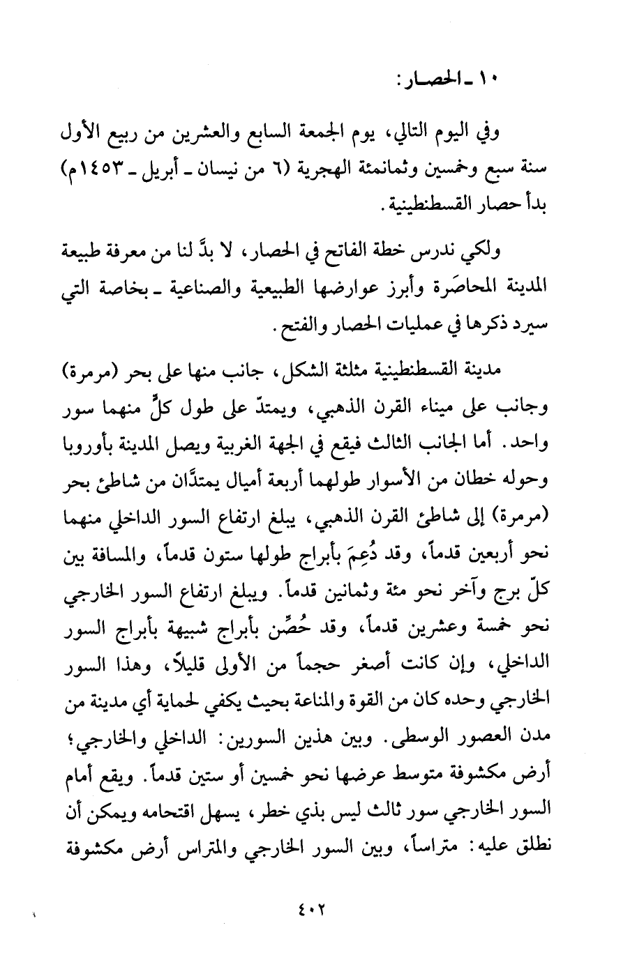 مدينة القسطنطينية مثلثة الشكل، جانب منها على بحر (مرمرة) وجانب على ميناء القرن الذهبي، ويمتدّ على طول كلٍّ منهما سور واحد. أما الجانب الثالث فيقع في الجهة الغربية ويصل المدينة بأوروبا وحوله خطان من الأسوار طولهما أربعة أميال يمتدَّان من شاطئ بحر (مرمرة) إلى شاطئ القرن الذهبي، يبلغ ارتفاع السور الداخلي منهما نحو أربعين قدماً، وقد دُعِمَ بأبراج طولها ستون قدماً، والمسافة بين كلّ برج وآخر نحو مئة وثمانين قدماً. ويبلغ ارتفاع السور الخارجي نحو خمسة وعشرين قدماً، وقد حُصّن بأبراج شبيهة بأبراج السور الداخلي، وإن كانت أصغر حجماً من الأولى قليلاً، وهذا السور الخارجي وحده كان من القوة والمناعة بحيث يكفي لحماية أي مدينة من مدن العصور الوسطى. وبين هذين السورين: الداخلي والخارجي؛ أرض مكشوفة متوسط عرضها نحو خمسين أو ستين قدماً. ويقع أمام السور الخارجي سور ثالث ليس بذي خطر، يسهل اقتحامه ويمكن أن نطلق عليه: متراساً، وبين السور الخارجي والمتراس أرض مكشوفة