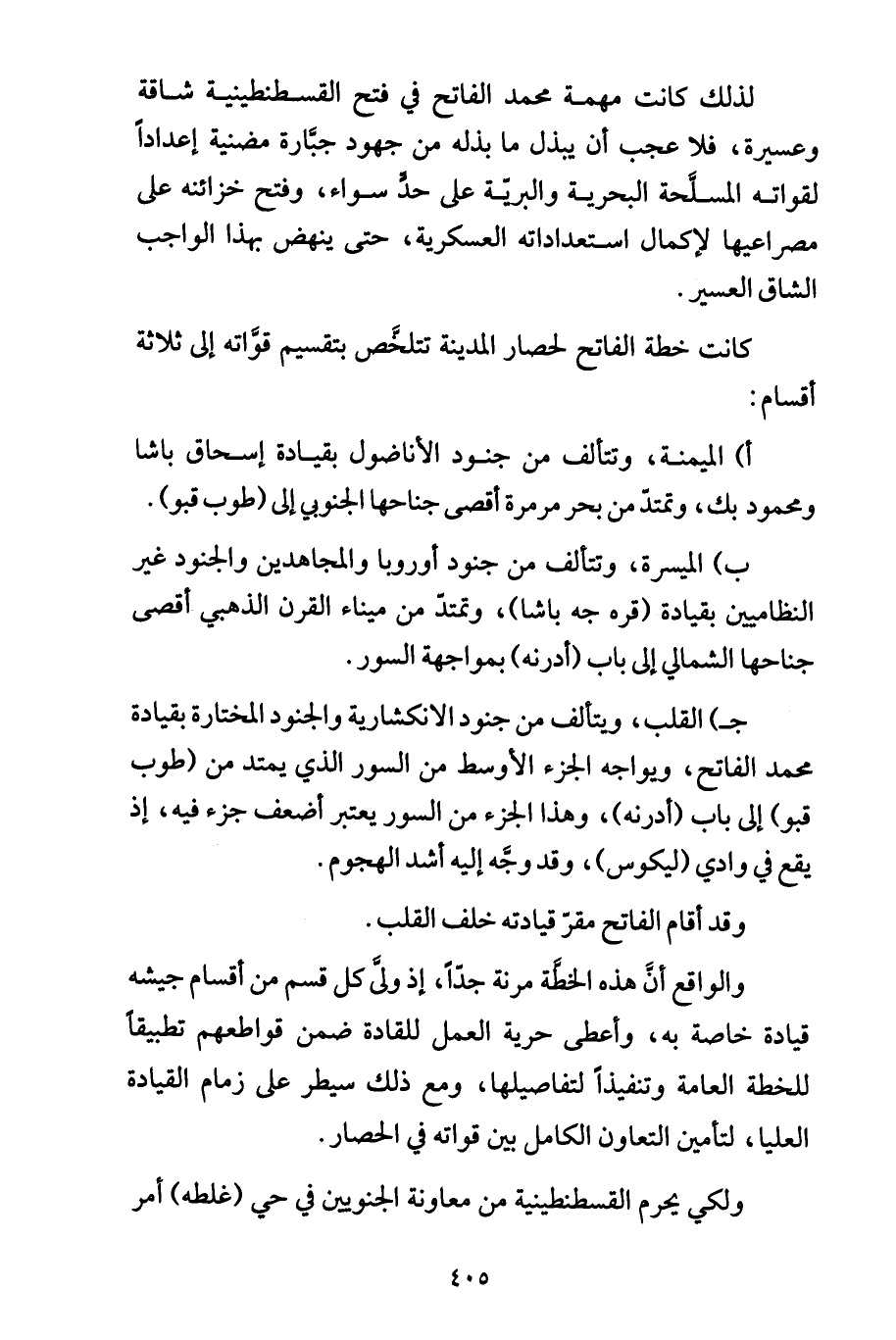 ج) القلب، ويتألف من جنود الانكشارية والجنود المختارة بقيادة محمد الفاتح، ويواجه الجزء الأوسط من السور الذي يمتد من (طوب قبو) إلى باب (أدرنه)، وهذا الجزء من السور يعتبر أضعف جزء فيه، إذ يقع في وادي (ليكوس)، وقد وجَّه إليه أشد الهجوم.