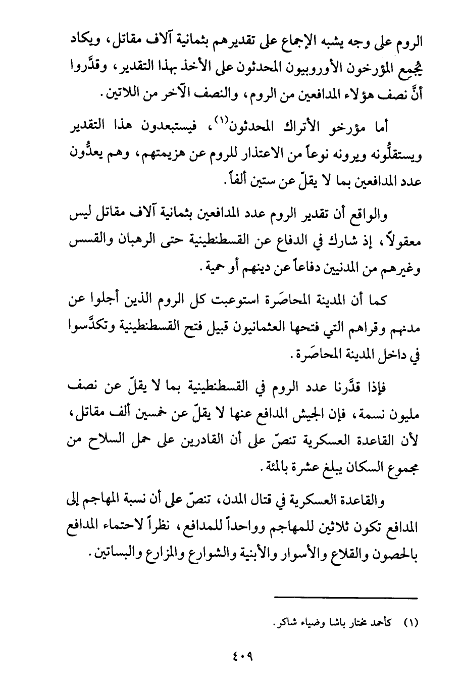 والواقع أن تقدير الروم عدد المدافعين بثمانية آلاف مقاتل ليس معقولاً، إذ شارك في الدفاع عن القسطنطينية حتى الرهبان والقسس وغيرهم من المدنيين دفاعاً عن دينهم أو حمية.